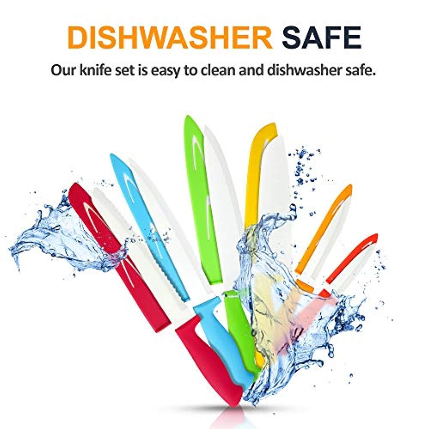 • ✅ SHARP & TOUGH BLADES- The knives in our set are designed to withstand repeated use and dishwashing over a long period of time! Stop using those dangerous old dull knives that can barely cut through a tomato without causing a splattering mess. Our knives cut smoothly and efficiently through your produce, and will hold up reliably time after time.