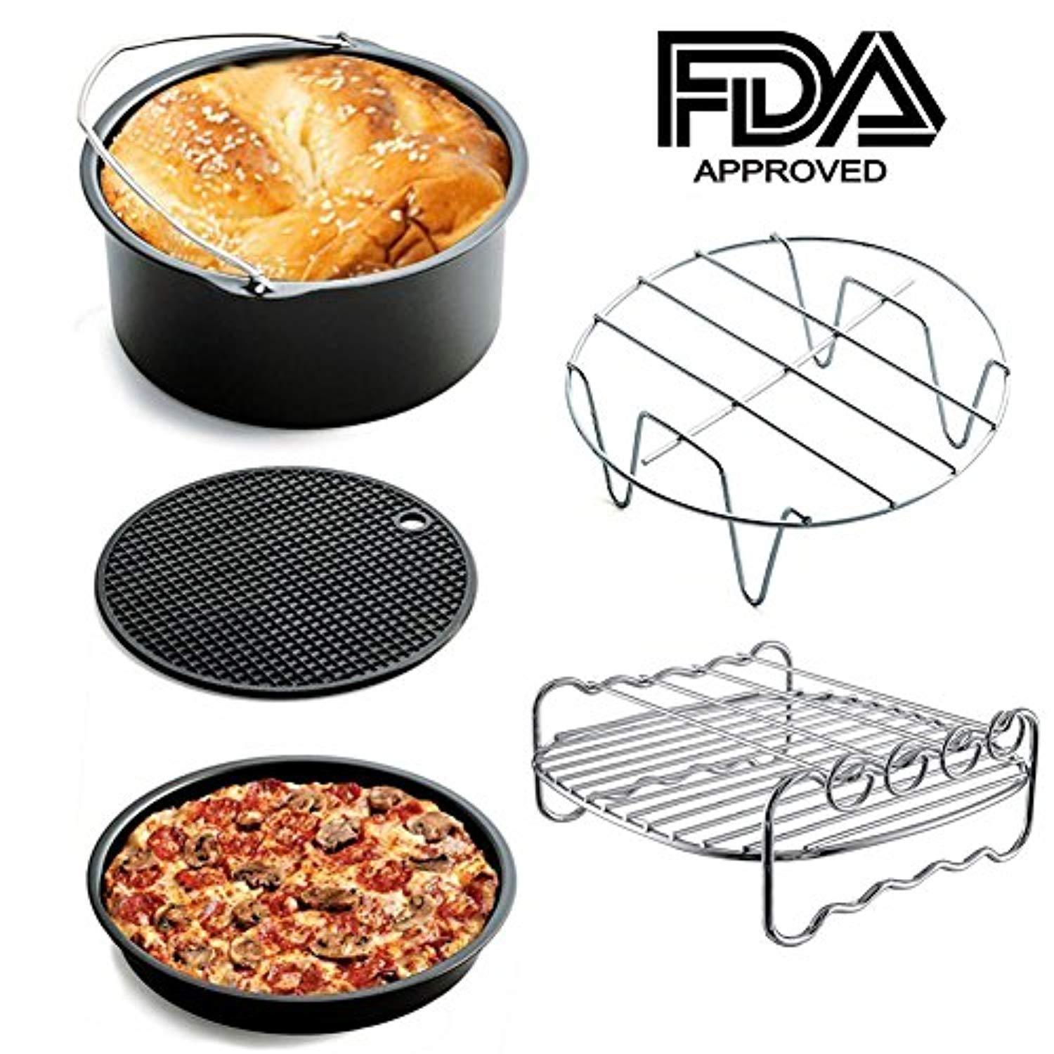 • ❤ Air Fryer Accessories Set:Include 1 Cake Barrel,1 Pizza Pan,1 Metal Holder,1 Multi-Purpose Rack with Skewers and 1 Silicone Mat.