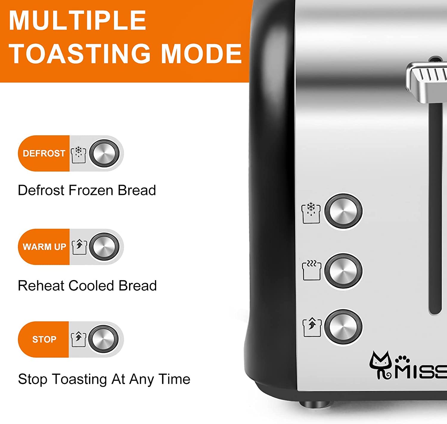 • Defrost/Warm/Stop Function: This 2-slice black stainless steel toaster has 3 modes: defrost, warm and stop. The defrost button will quickly heat up your frozen bread; the heating button can help you achieve the baking of the breads; the STOP button can cancel toasting at any time.