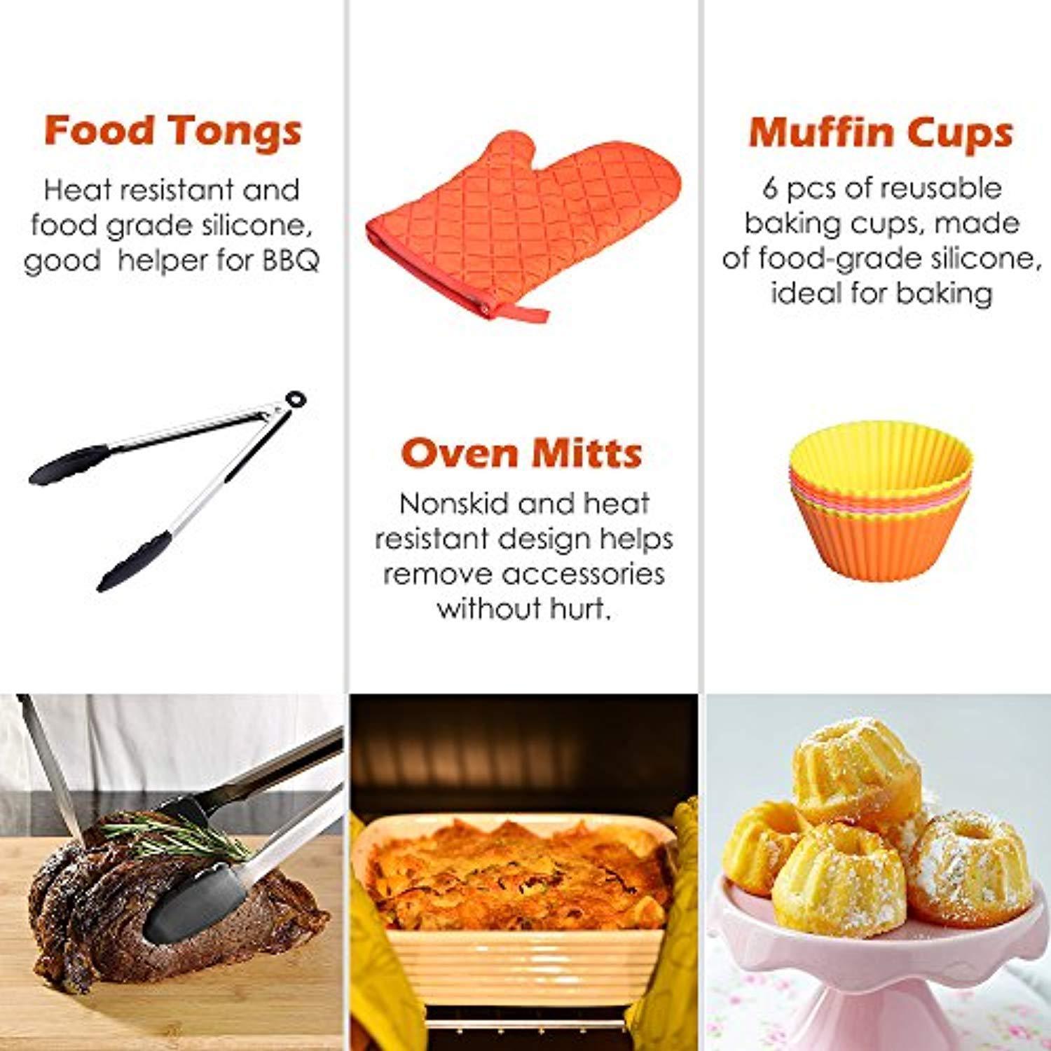 • 🔥 ONE SET INCLUDES ALL YOU NEED - We have carefully chosen what might be used for a air fryer during our using--9 pcs of accessories, including 1 cake barrel, 1 pizza pan, 1 toasting/warming rack, 1 skewer rack,1 silicone mat, 1 bread rack, 1 pcs of oven mitt, 1 food tongs (black) and 6 pack muffin cups. They are enough for most of your daily use.