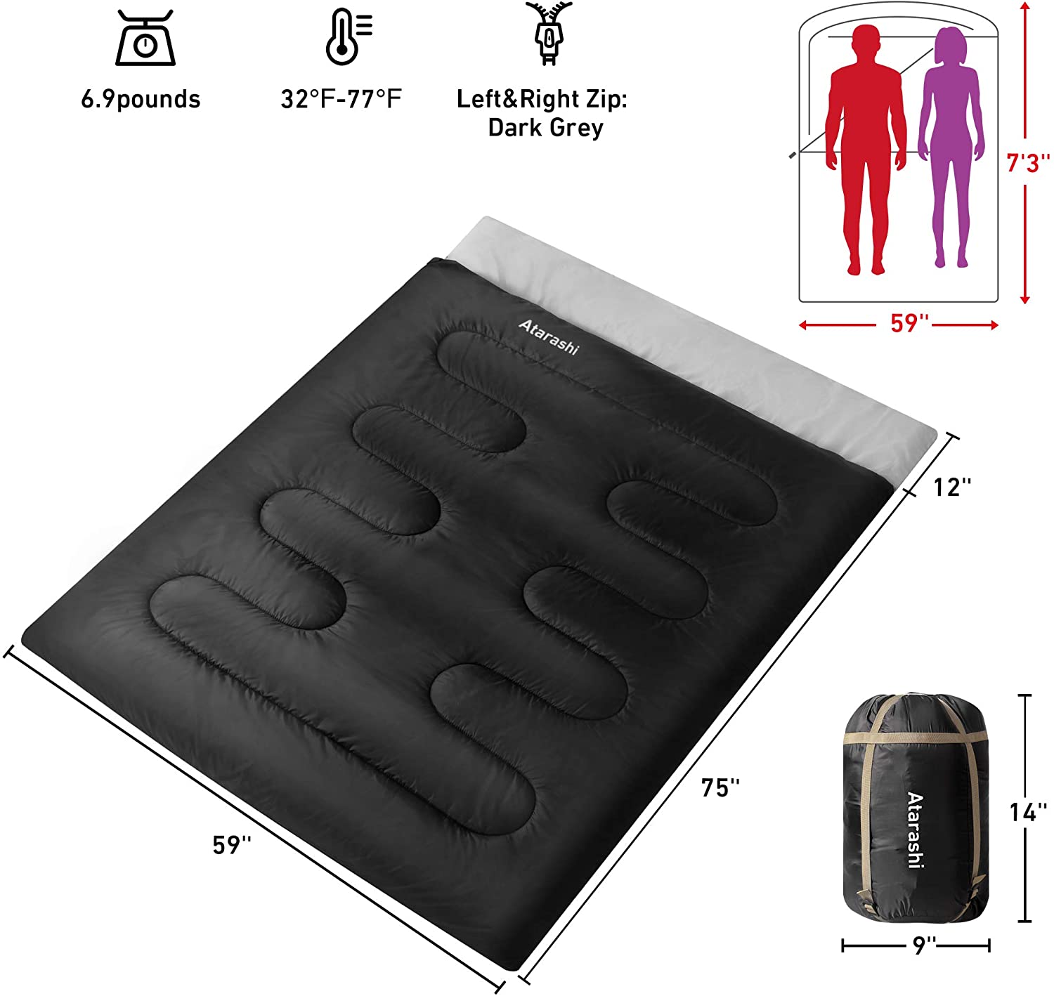 • FREE COMBINATION& DETACH:Left-side zippers allow the regular sleeping bags to be zipped together with a right-zipper wide bag to create a double bed; Double sleeping bag can be unzipped and separately zip into two individual sleeping bag. Atarshi sleeping bag of all size can unzip into a blanket for car camping.