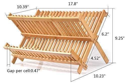 • SIZE and GUARANTEE: unfolded: 17"L x 13"W x 9.6"H; folded:17"L x 12.9“W x 1.4"H. Guarantee: this bamboo dish rack come with 100% Satisfaction Guarantee. If for any reason our product doesn't meet your current standards, contact us, a replacement or a refund is available.