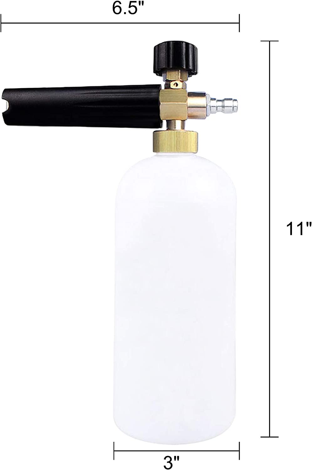 • Adjustable Foam Concentration: Our foam cannon sprayer works with any gas or electric pressure washer. Save soap and water by picking the perfect concentration. Top dial of the foam cannon is for foam dispensing amount and the foam gun nozzle adjusts the spray pattern (cylindrical to decent fan pattern). Pressure washer requirements for it to work properly is 2.0 GPM, a minimum PSI of 1000 and a maximum PSI 4350 (Maximum BAR 210 ).