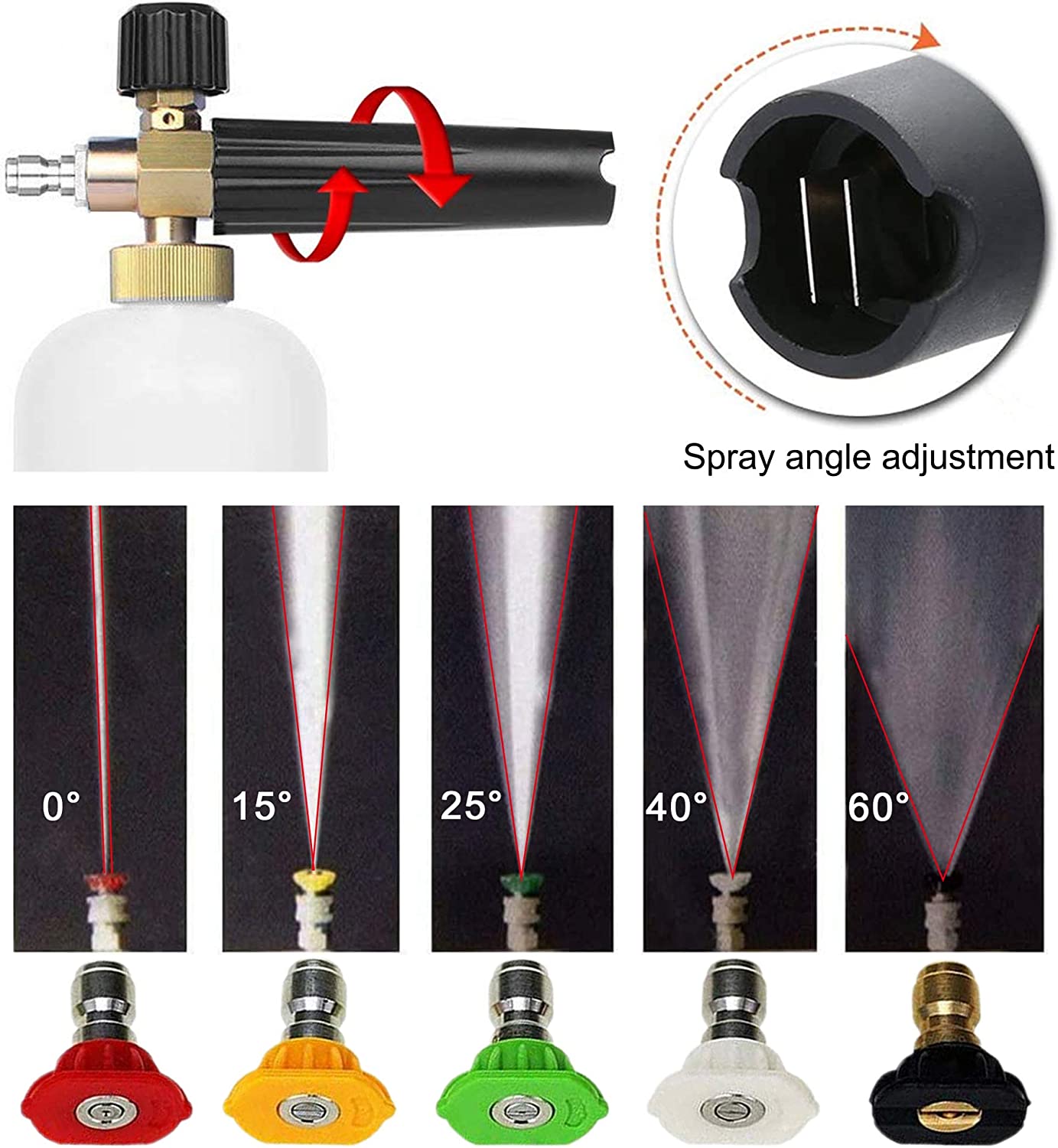 • Package Include:foam cannon set includes 1 spray gun, a spray bottle with an adjustable pressure knob. The spray bottle has a large capacity of 1 liter/1000 ml, 1 soft scrub sponge, 1microfiber towel, 5 different types of nozzles (0°,15°,25°,40°,65°), Meet your need in different situations.