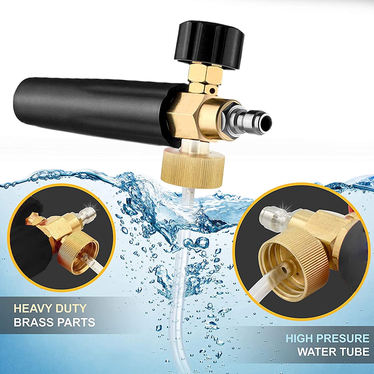 • Easy to Use: Just fill up the reservoir bottle with soap, click in to your existing pressure washer lance or trigger, adjust the knob for your desired foam level, and spray! Hose water from compressor comes quick for a cleaner advanced automotive dirt removal.