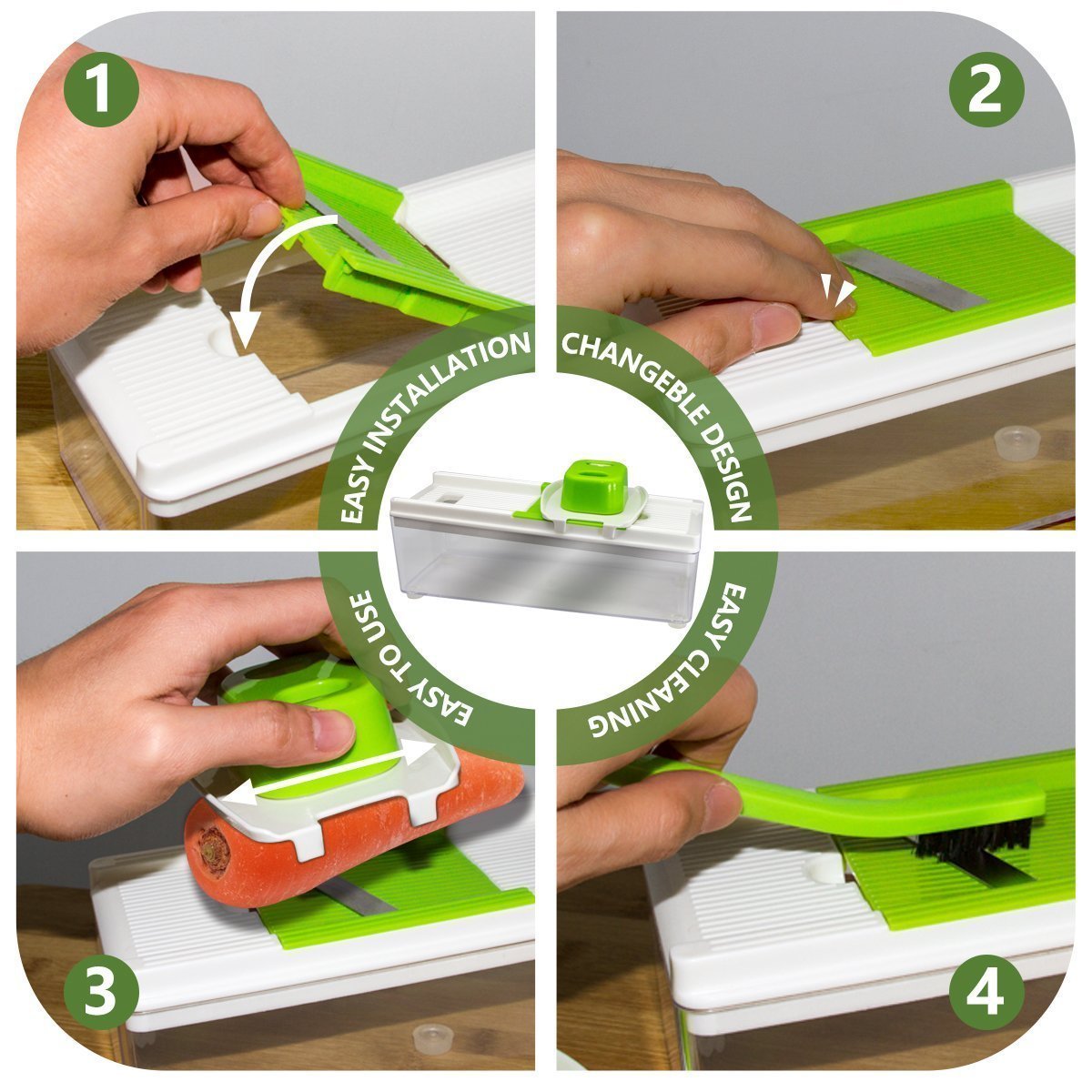 • SAFETY & HUMANIZATION DESIGN - Safe finger guide design can easy to securely grips on Vegetables and fruits to keep hand free and protect hands from accidental cuts. Soft Grip / Non-Skid Base to keep slicer in place whilst working on flat surface.