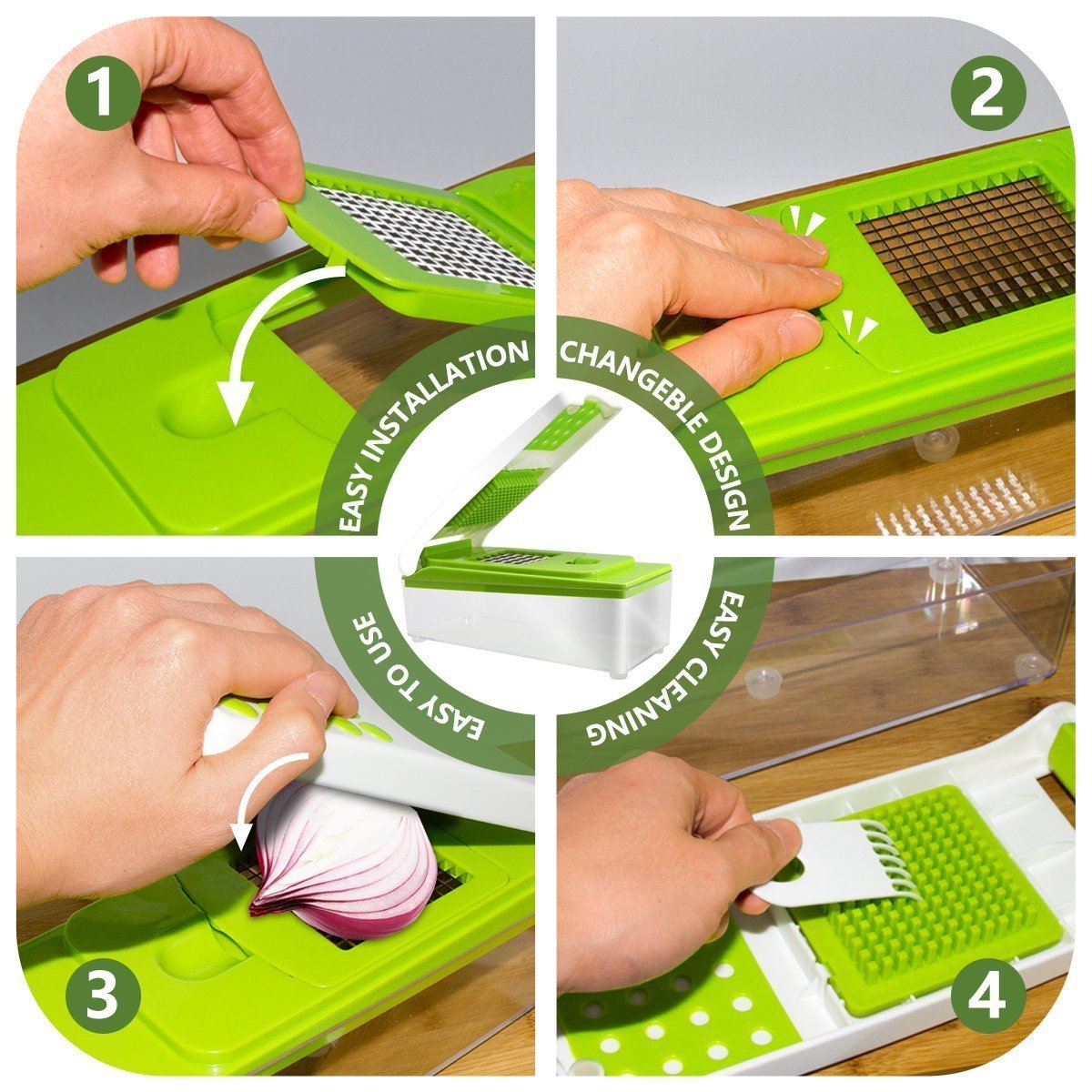 • EFFICIENCY & EFFORTLESS - With the vegetable chocker, you have a kitchen helper that greatly shortens the time from the start of cooking preparation to the serving of the meal. It offers numerous cutting results: cubes, pens, slices, stripes, quarters and planed - all in one set! It's a great system for preparing salads, fruit and vegetable dishes and so on. Effortless, fast and completely without electricity.