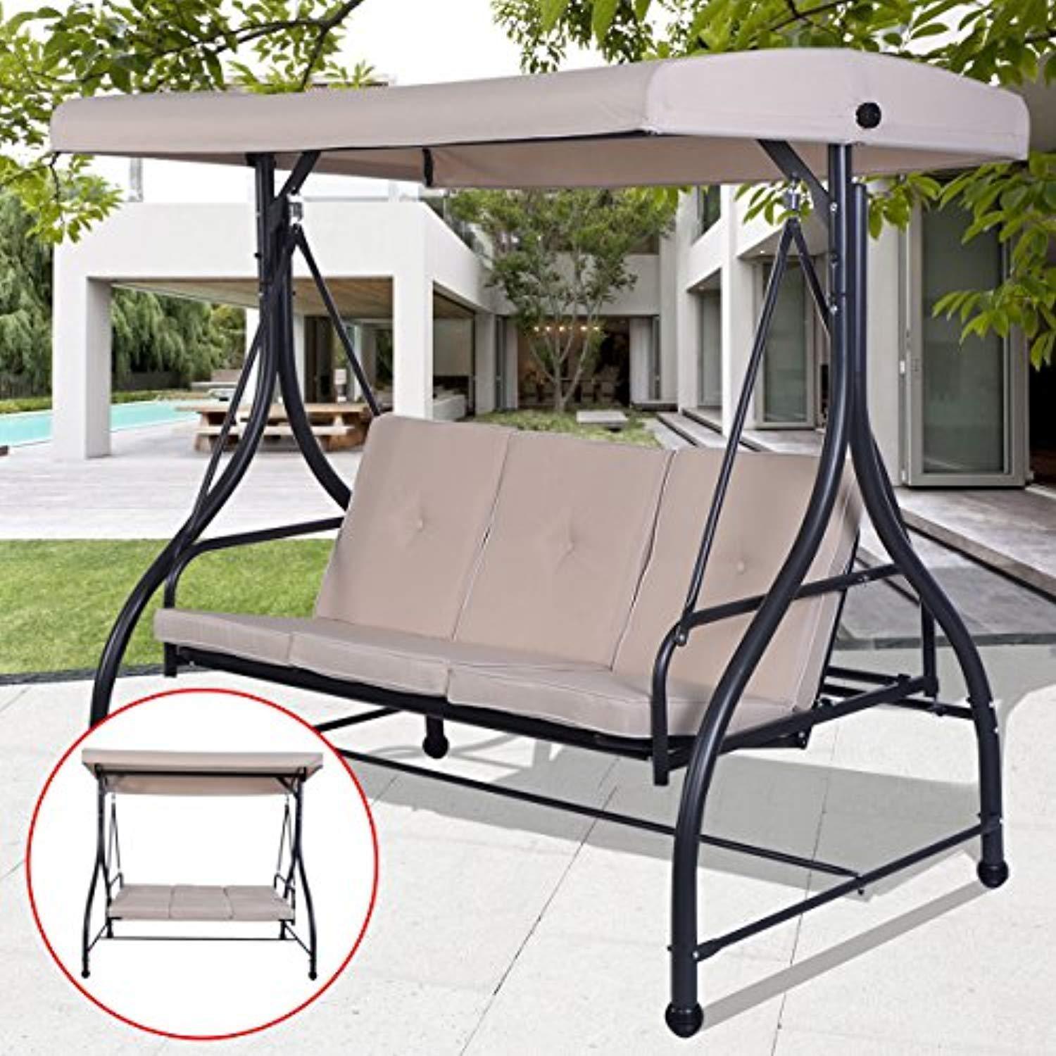 Beige Converting Bed Swing Hammock Chair Patio 3 Person Seat With Canopy Outdoor Furniture