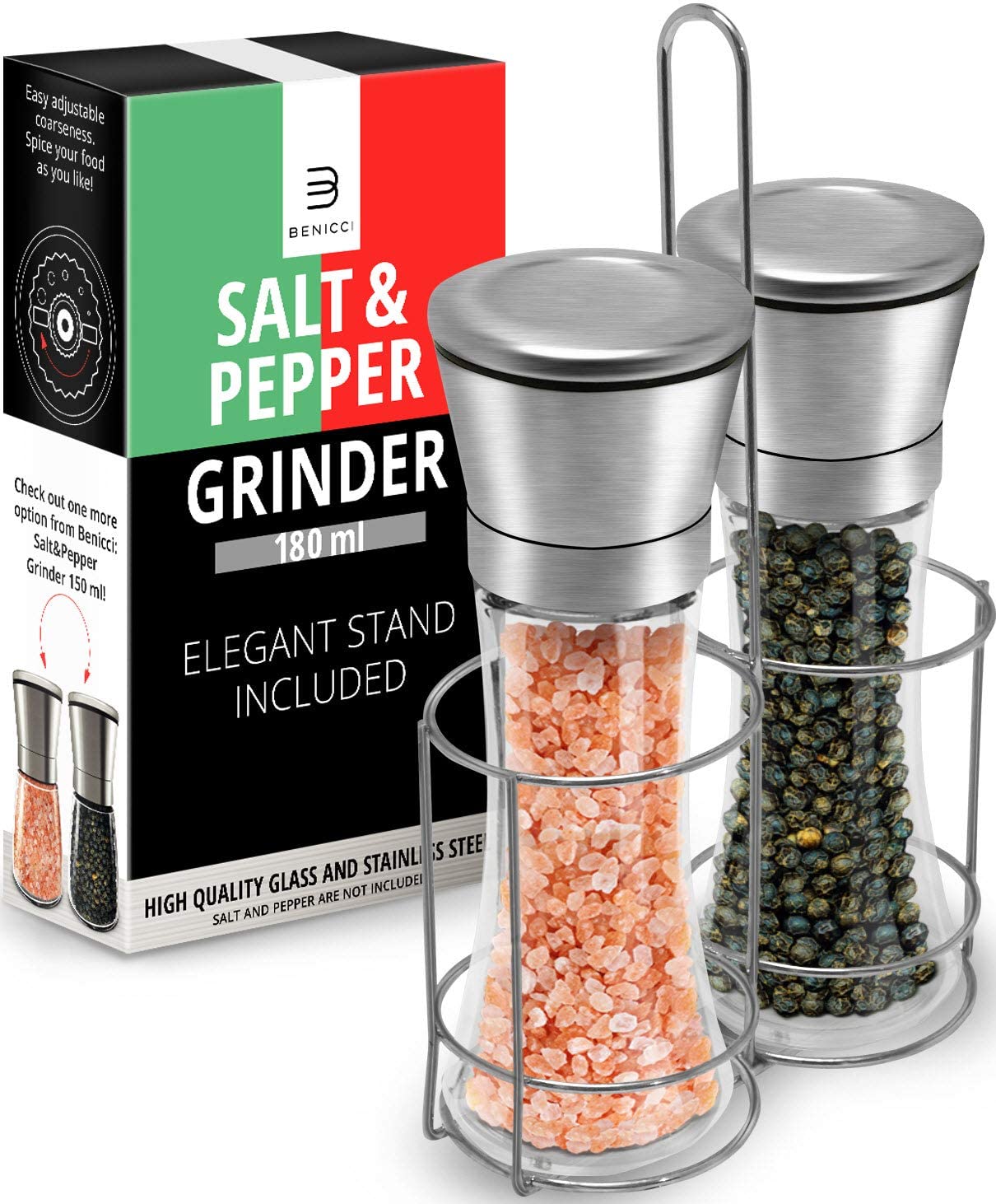Benicci Salt & Pepper Grinder Set – 2 Tall 6 Oz Glass - 180 ml Spice and Sea Salt Shakers With BONUS Stand - Adjustable Coarseness Mills