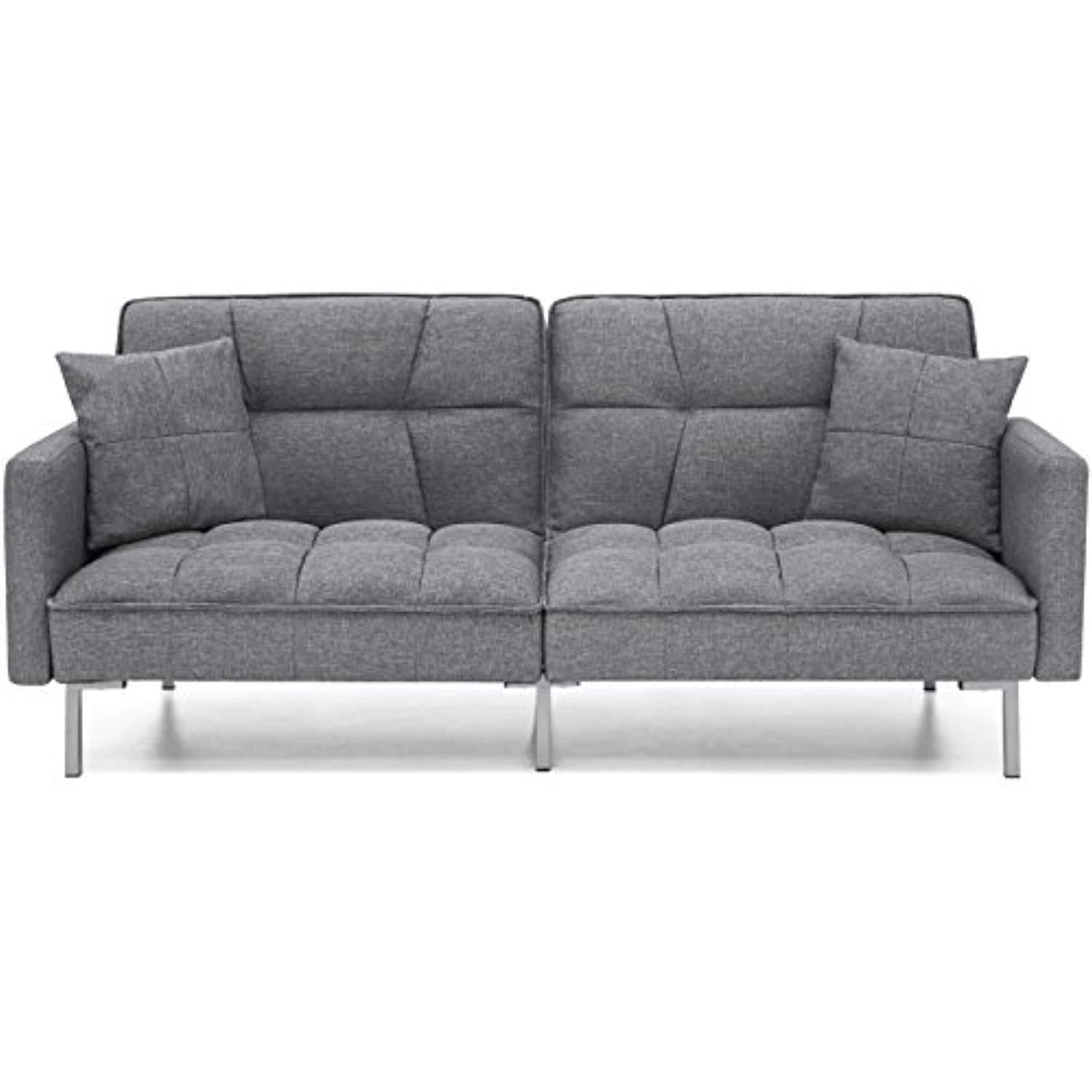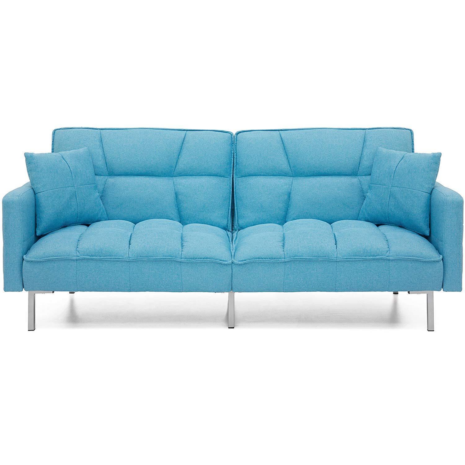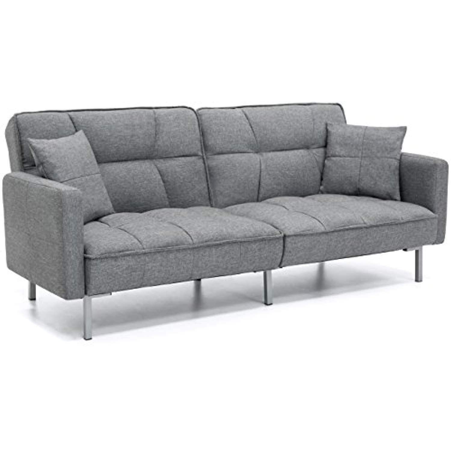 Best Choice Products Living Room Convertible Linen Fabric Tufted Splitback Sleeper Plush Futon Couch Furniture w/ Pillows - Light Sea Foam Gray