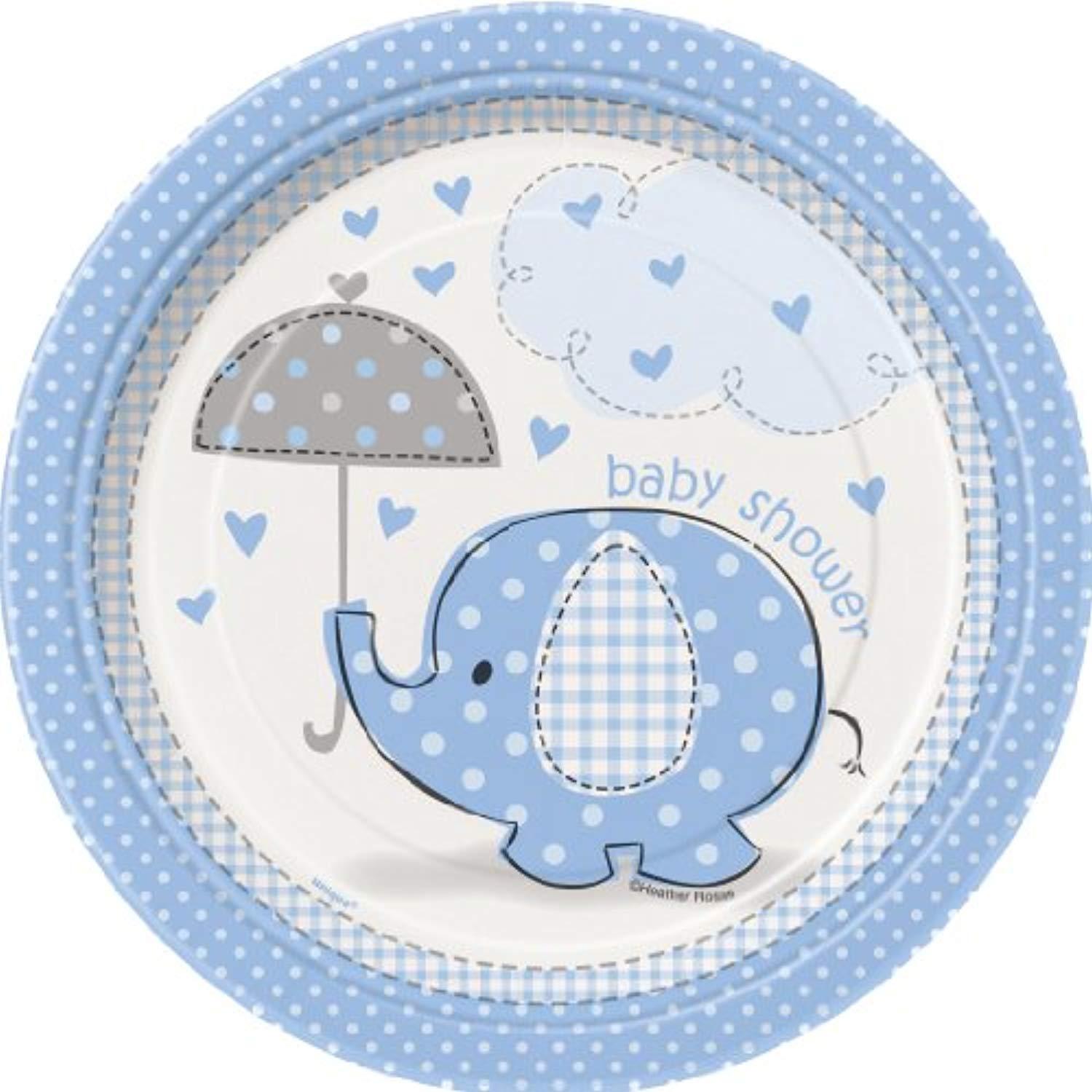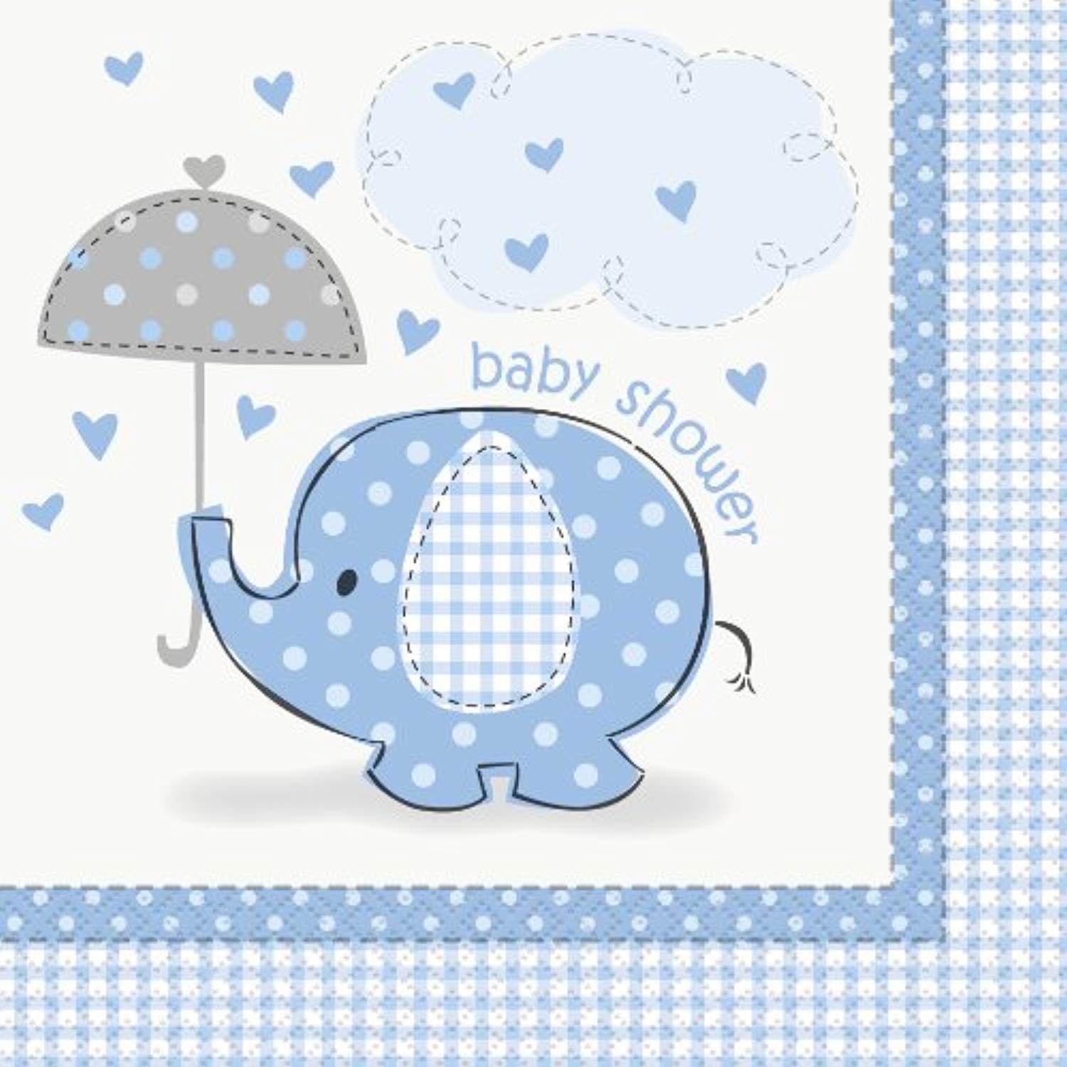 Adorable blue elephant themed baby shower party package includes service for 16 guests. Set includes 16 dinner plates, 16 cake plates, 16 napkins, 16 cups and 1 tablecloth. Perfect for serving party foods and desserts. Disposable tableware makes after party clean up easy!