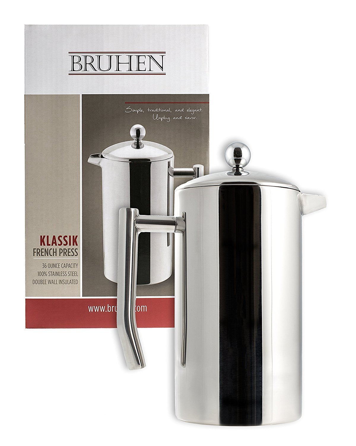Bruhen Klassik French Press - 34 Ounce Stainless Steel - Double Wall Insulated - 4 Mugs (1 Liter) - Mirror Finish - Dining Room to Kitchen to Camping!