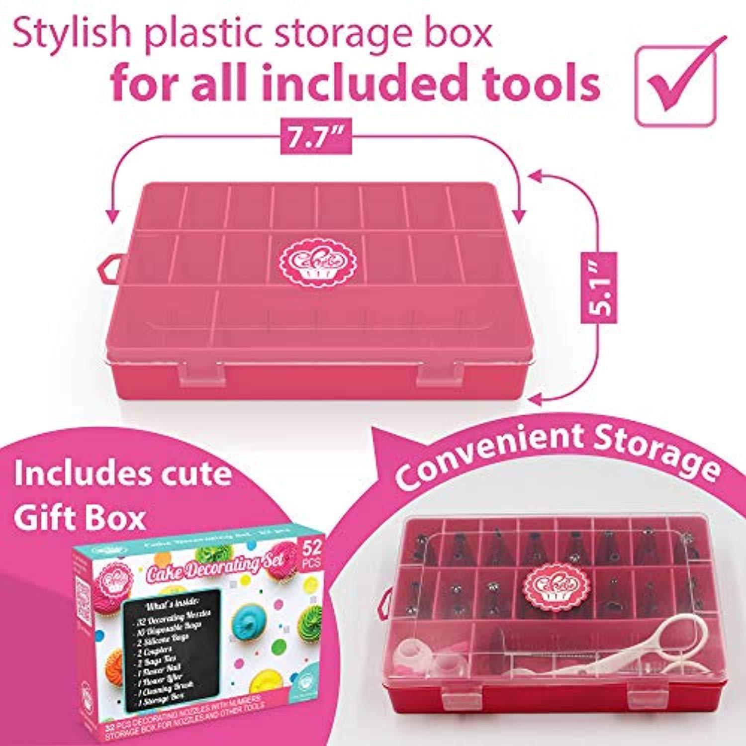 • ✅CAKE DECORATING SUPPLIES. No need spending your precious time looking for the cake decorating supplies that you might need for creating your boldest cake designs. The Cakebe set includes the most necessary items that a baker needs for perfect cake decoration: 32 numbered stainless steel tips, 2 couplers, 2 reusable silicone pastry bags and 10 disposable decorating bags, flower nail and lifter. 2 bags ties, decorating guide and storage box.