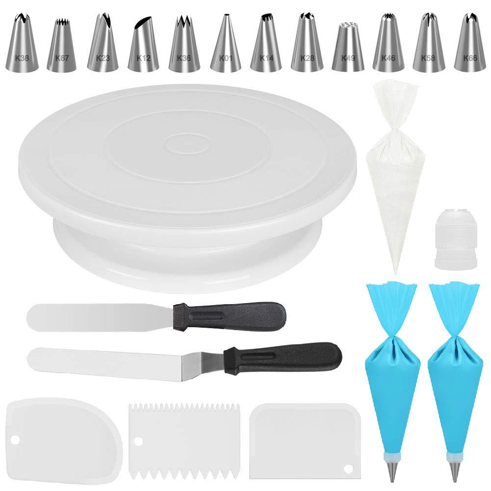 • Revolving Cake Turntable: Turns smoothly in clockwise or anticlockwise direction, allows you easily create beautiful borders when decorating cakes. (NOTE: The decorating tips, bags and scraper are at the bottom of the cake turntable when you open the package)