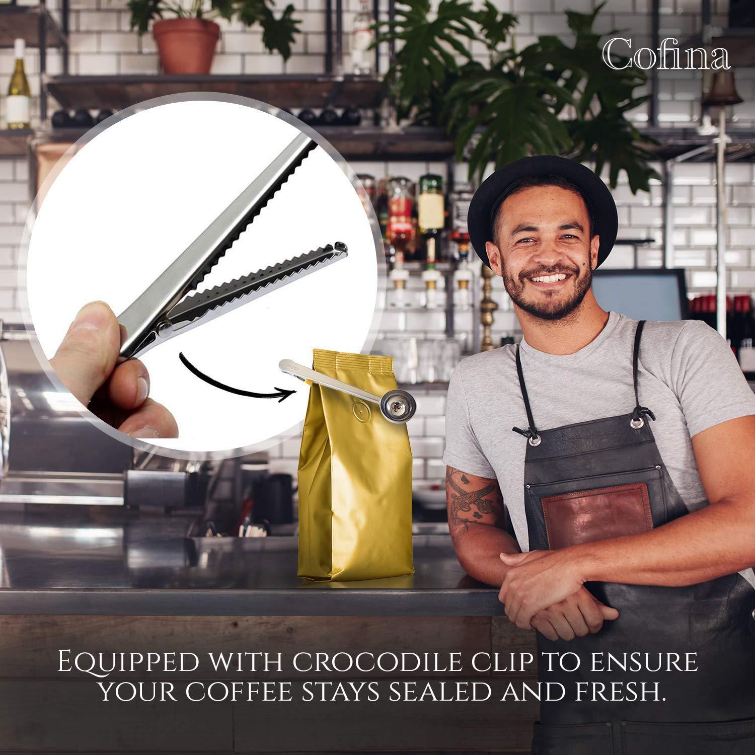Cofina Coffee Scoop Measuring Spoon - Coffee Spoon with Clip, stainless steel tablespoon to close your coffee bags. Use One Scoop per Cup and seal your coffee bag
