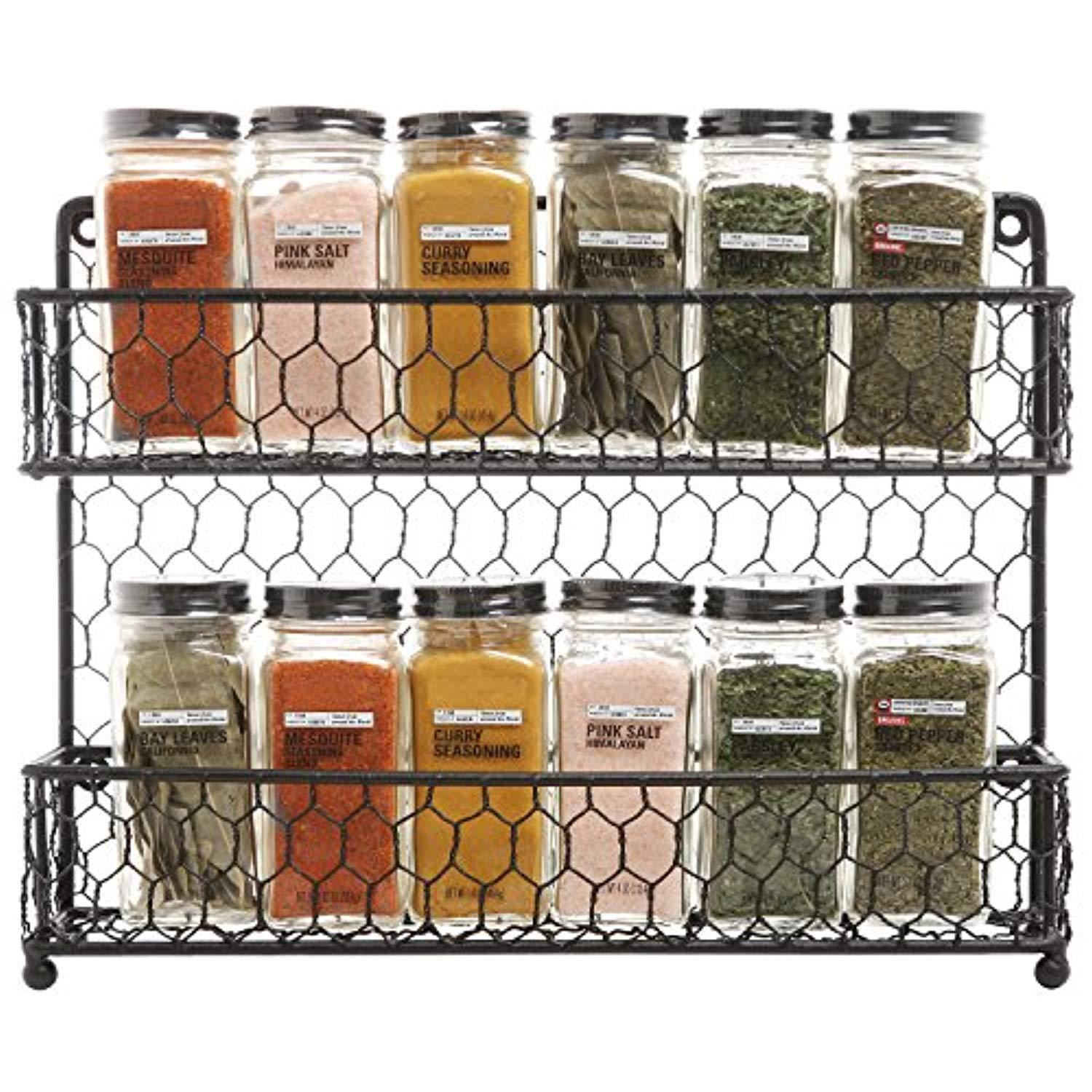 Country Style Black Dual Tier Wire Kitchen Counter-top or Wall Mount Spice Rack Jars Storage Organizer