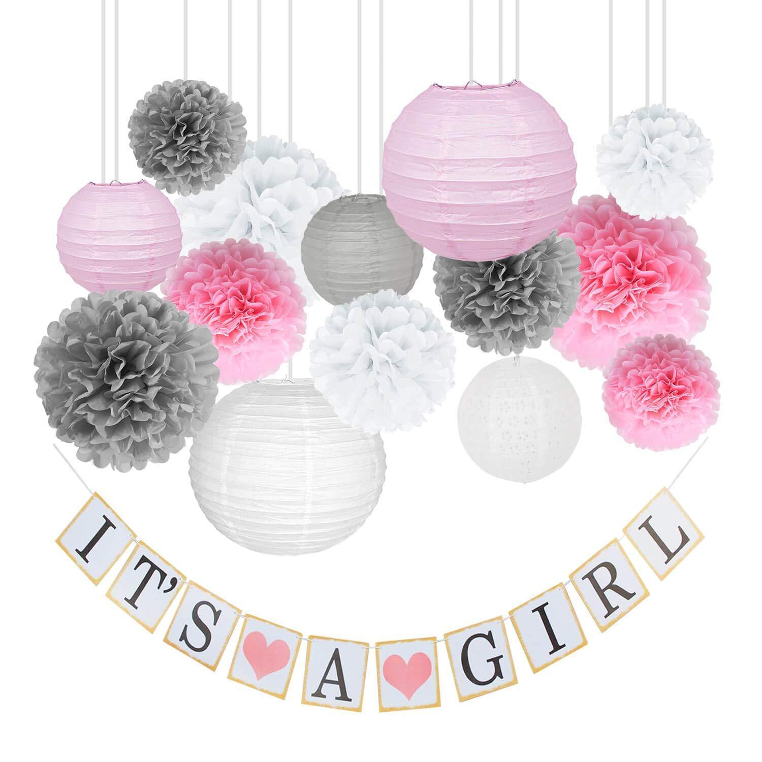 Dinomisk Premium Girl Baby Shower Decorations Kit for Girls – Includes Pink, White, and Grey Party Favors, Decorative Paper Lanterns, Tissue Paper Flower Pom Poms, Its A Girl Banner, String, 26 Pieces