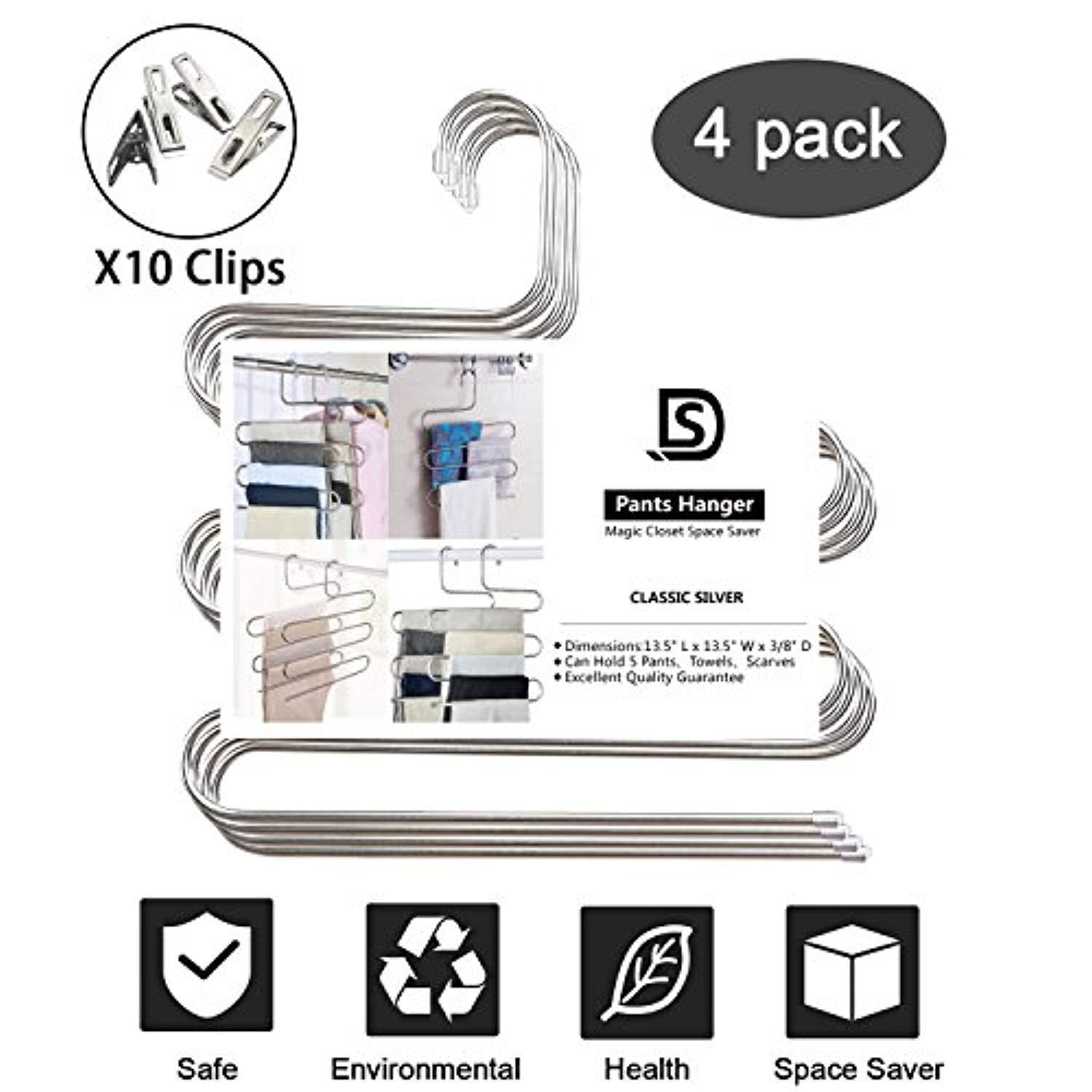 DS Pants Hangers S-Shape Trousers Hangers Stainless Steel Clothes Hangers Closet Space Saving Organizer for Pants Jeans Scarf Hanging Silver (4 Pack with 10 Clips)