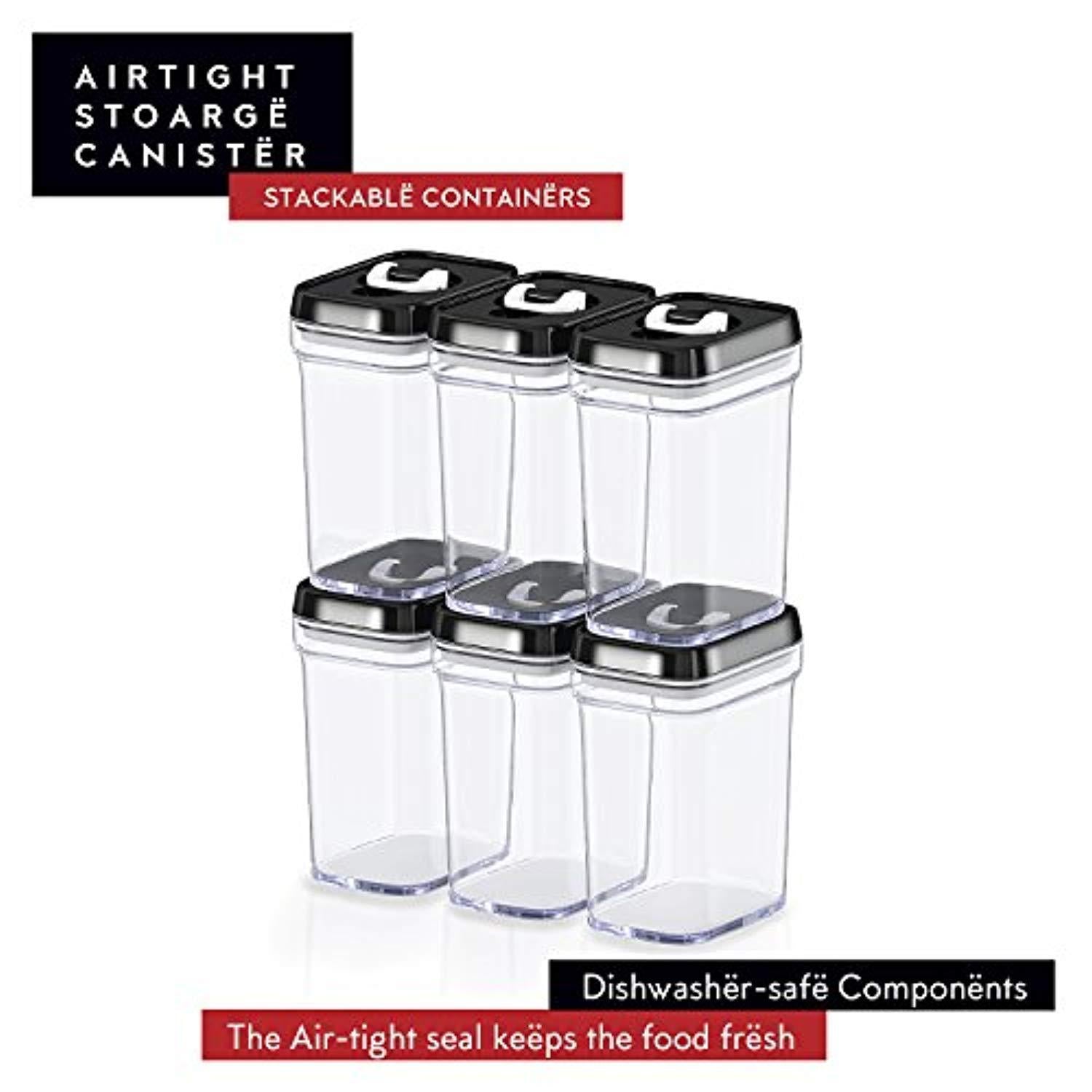 • 6 SAME SIZE STORAGE CONTAINERS: This kitchen organization set includes 6 medium air-tight containers that are all the same size. Each one has a 1-liter capacity (0.9QT/ 4.2 cups/ 0.26 gallons), measures 5.2” x 3.8” x 6.25”, great for storing everything from flour, crackers, snacks, pasta, coffee, rice, sugar, to smaller servings of cereal.