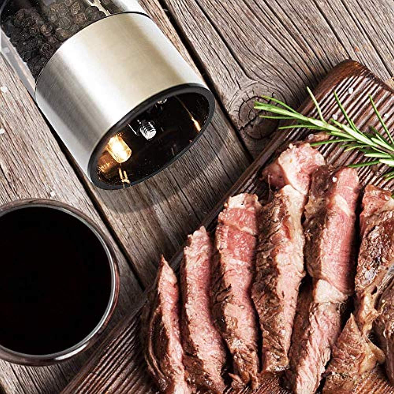 • 💡LED LIGHT and COVER: Automatic light is illuminated when the button is pushed to begin grinding your spices; No longer worry about over or under seasoning your meals; Each mill includes a CAP at the bottom to ensure that your spices stay fresh and there is no mess to clean up