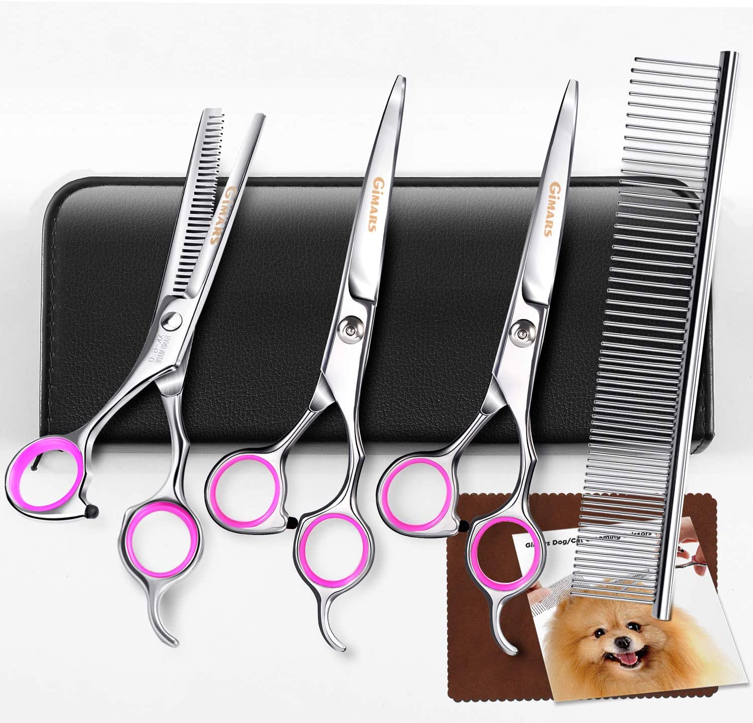 • 【Complete Dog & Cat Grooming Kits- Straight & curved & thinning Shears & Comb】- Our dog scissor kit comes with zippered storage case, cleaning cloth, 6.7 inch thinning shears for dogs, 7.3 inch straight scissor, 7.3 inch curved shears dog grooming. These dog scissors work great on removing tangles, mat, blending, loosening hair and dirt.