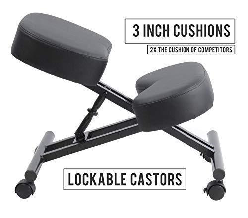 • ✅COMFORTABLE MODERN DESIGN (THICK CUSHIONS) With a strong black metal base built to last, sleek THREE INCH foam cushion to keep you comfortable all day, and 4 castor rolling wheels with brakes to keep you moving freely, you will love your new kneeling chair. Our heavy duty and sturdy construction chair also supports up to 250lb, yet blending nicely into your home, office, or classroom.