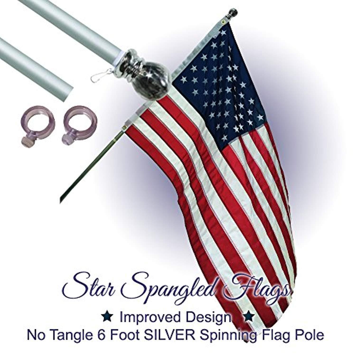 Flag Pole - 6 Foot Silver Brushed Aluminum No Tangle Spinning Flagpole with Silver Globe Built Tough and Beautiful to Fly Grommeted or Sleeve Flags Proudly in Residential House or Commercial Settings