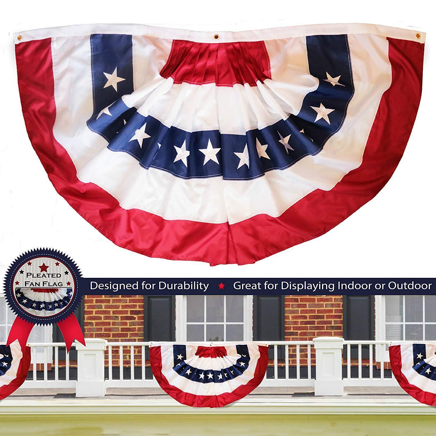 • DESIGNED FOR DURABILITY: This pleated bunting American fan flag is made of waterproof 210D Polyester with 3 heavy-duty brass grommets. It is great for displaying indoor or hanging for outdoor use.