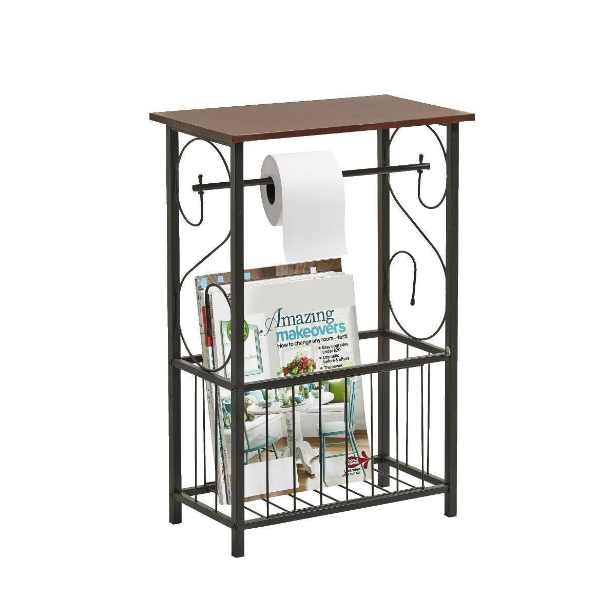Gramercy Bathroom Table and Stand with Toilet Paper Roll-Bar Holder and Storage Rack - Black Metal Frame with Scroll Design, Walnut Color Wood Top - Ideal to Keep Essential Toiletries at Easy Reach