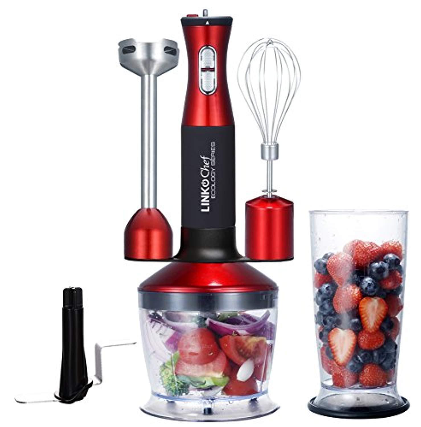 Immersion Blender LINKChef 4-in-1 Hand Blender Stick Powerful Low Noise Large 800ml Beaker, Stainless Steel Whisk and 500ml Food Chopper, BPA-Free&FDA, Red/Black(HB-1230)-3 Years Warranty (Red and black)