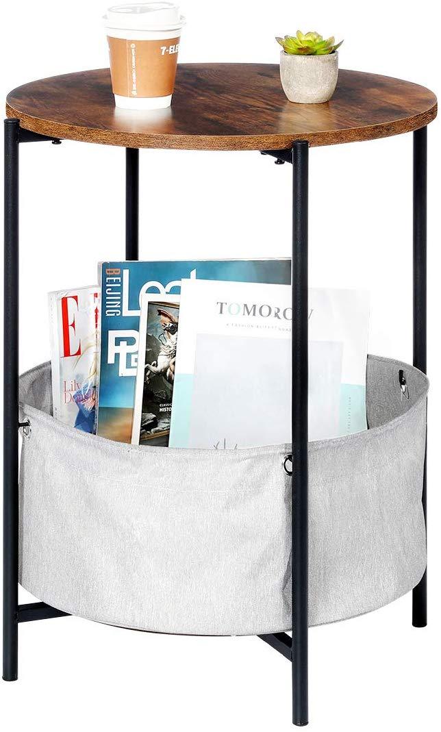 KingSo End Table, 2-Tier Round Industrial Nightstand with Storage Bag, Easy Assembly & Sturdy Sofa Coffee Table for Living Room, Bedroom, Metal Frame Side Table Rustic Brown