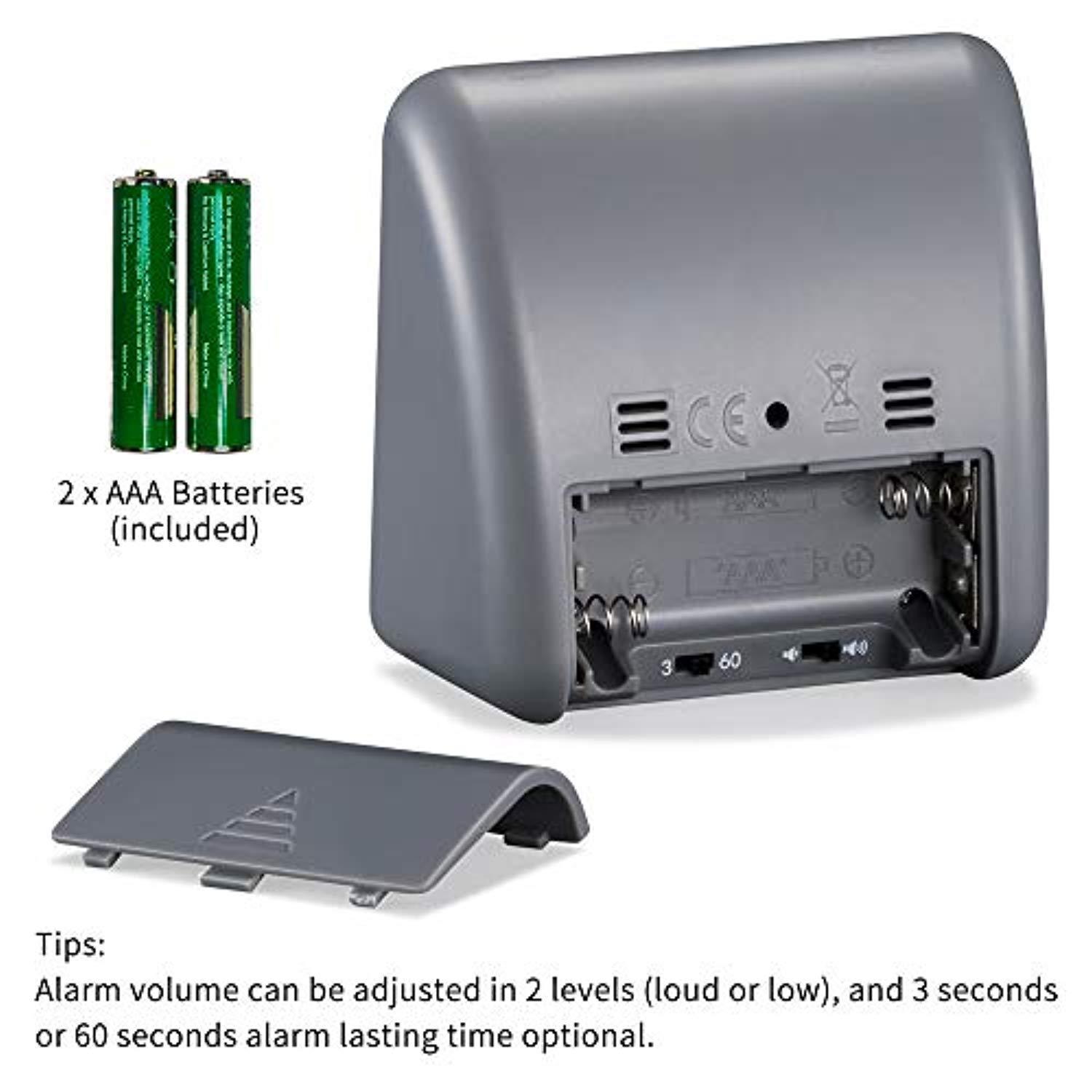 • 🕑 Two AAA Battery included,Adjustable volume and beep time up to two levels(3 seconds and 60 seconds continuous alarm time)