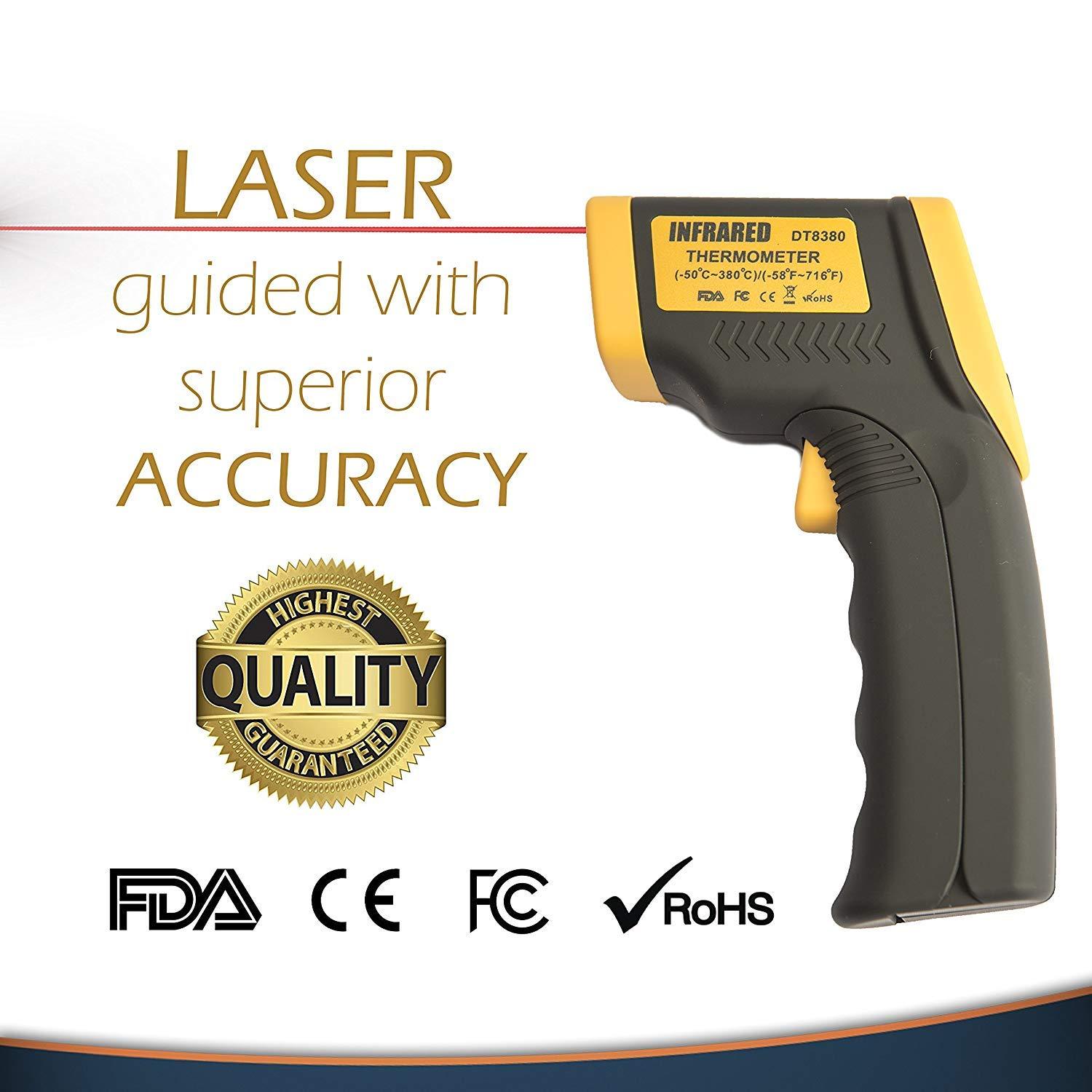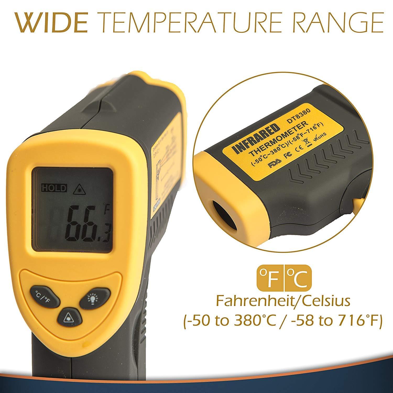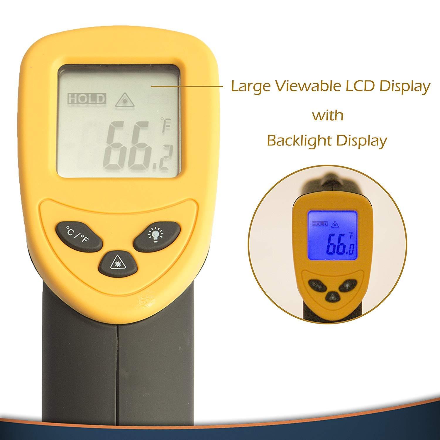 Safety. Fast Measure. Instant Read This infrared thermometer can be used to instantly receive temperature degrees by simply pressing the trigger, allowing you to easily measure the surface temperature of a dangerous, difficult-to-reach or even moving object. It's easily use, fast measuring, high precision,easy read, effectively used in kitchen, industrial, maintenance and other fields.For measure the temperature more accurately, it's can adjust the emissivity; For make it easier to read, it uses a HD backlight LCD color screen.