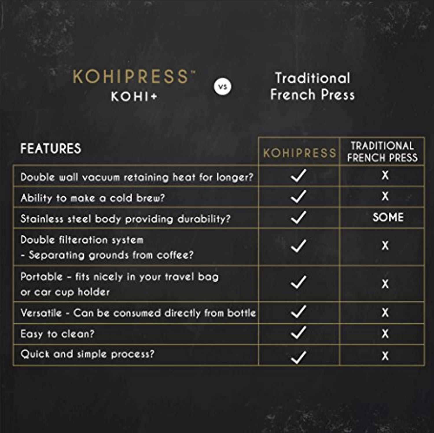• KOHIPRESS The Original Portable French Press Coffee Maker | Vacuum Insulated Travel Mug | Premium Stainless Steel | Hot and Cold Brew (12 oz) | Great for Commuter, Camping, Outdoors and Office (Black)ALL-IN-ONE brewer and insulated travel mug - The versatile KOHIPRESS uses a full immersion steep with a pressurized plunger press ( a similar method as the Aerobie Aeropress ) to make a rich, smooth cup of coffee.