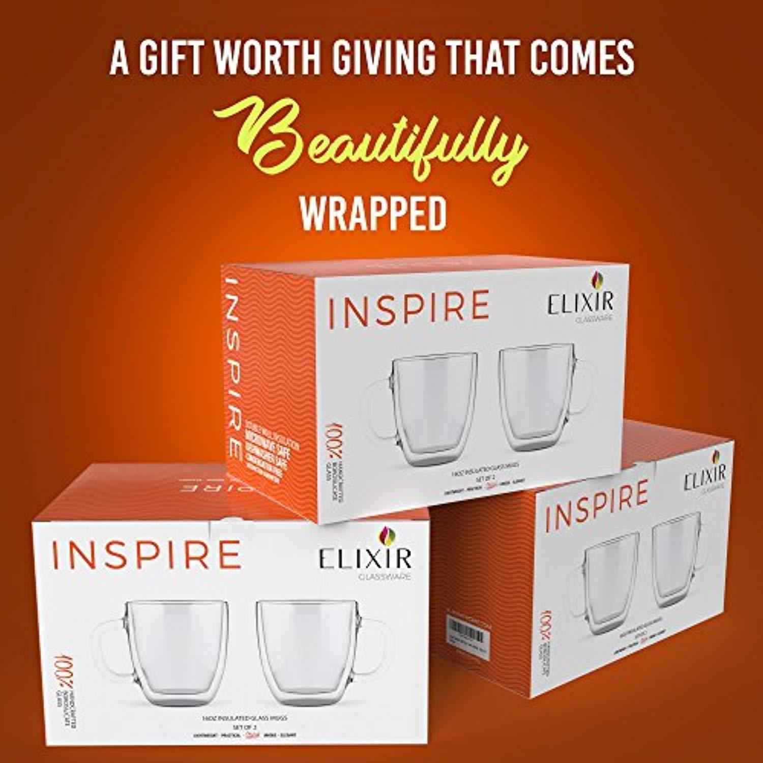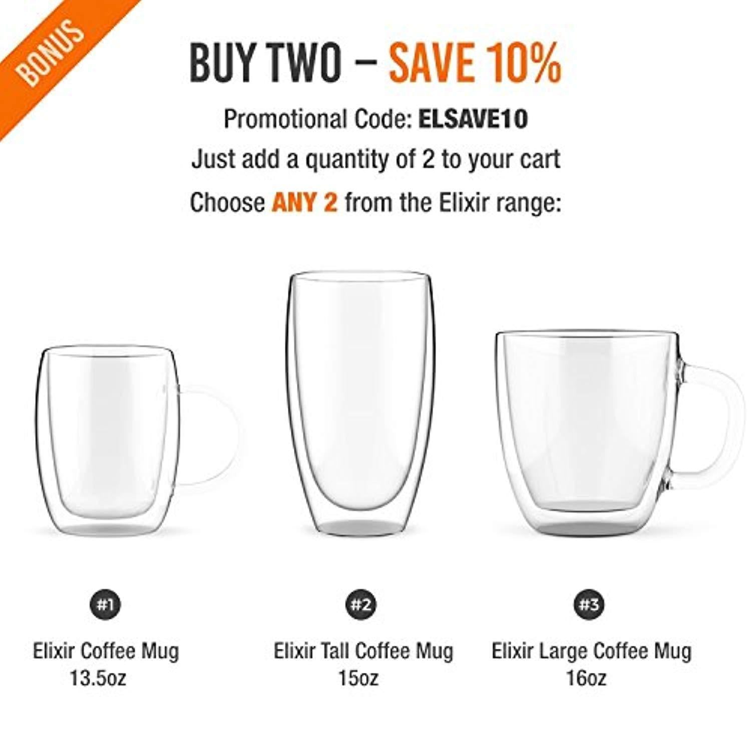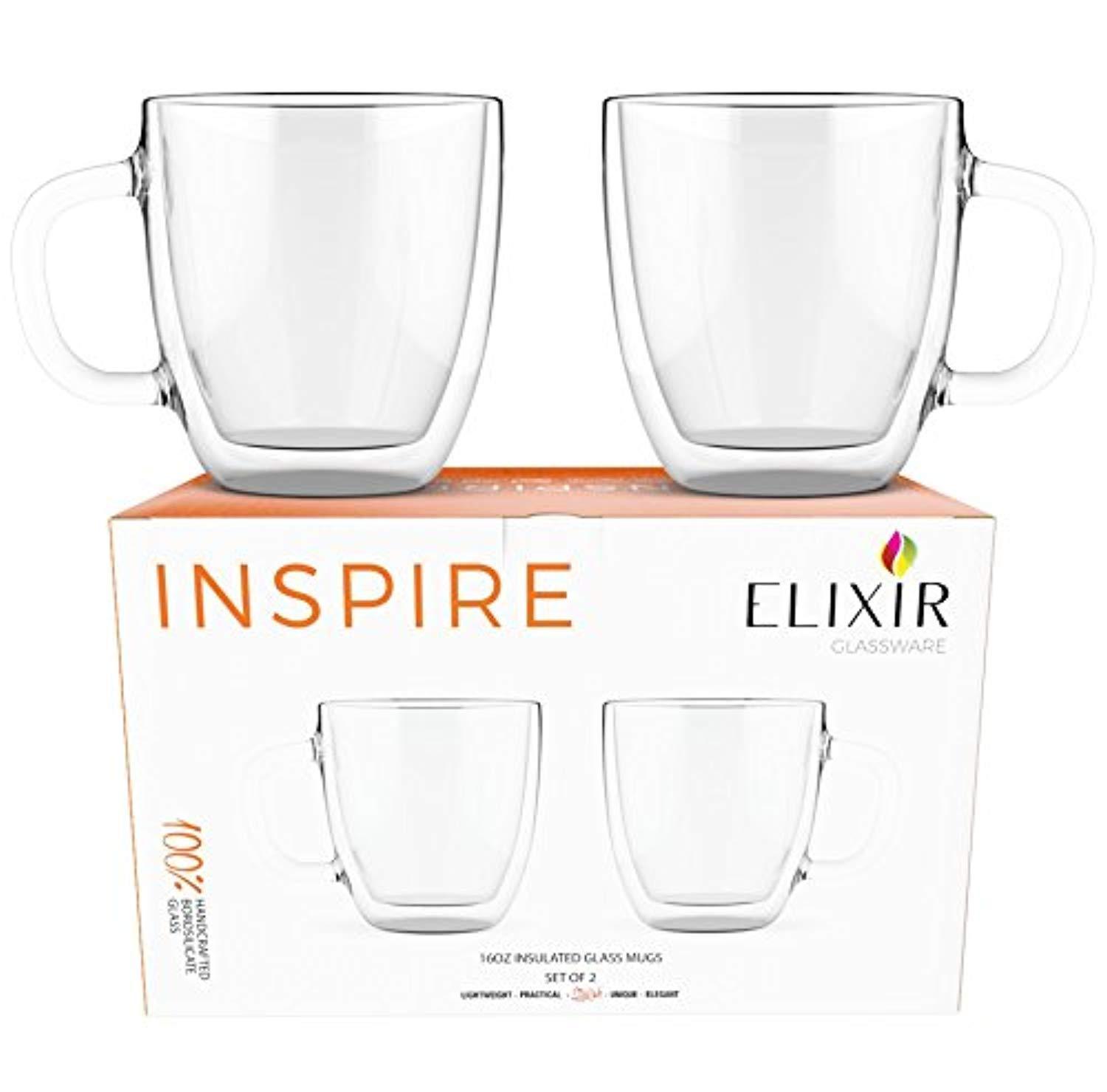 Large Coffee Mugs, Double Wall Glass Set of 2, 16 oz - Dishwasher & Microwave Safe - Clear, Unique & Insulated with Handle, By Elixir Glassware