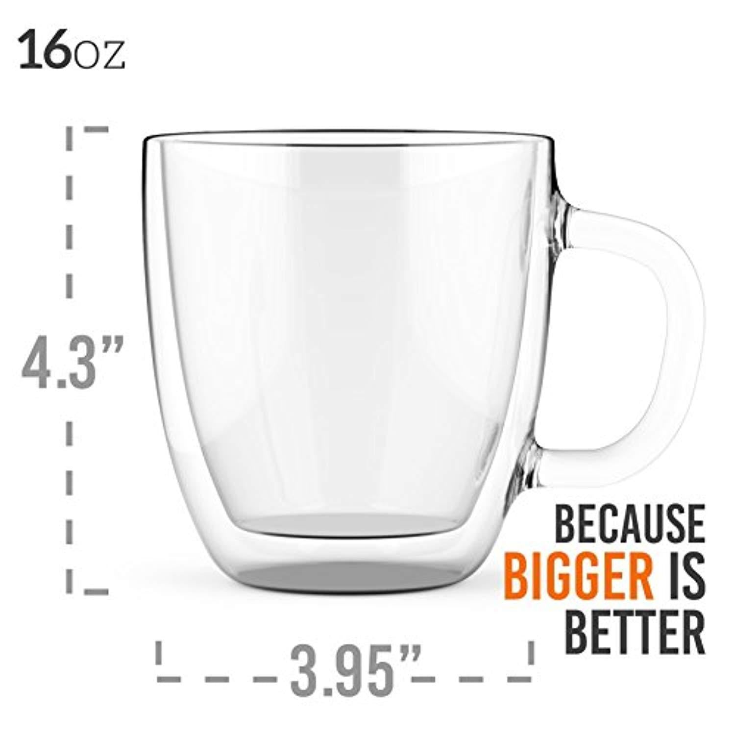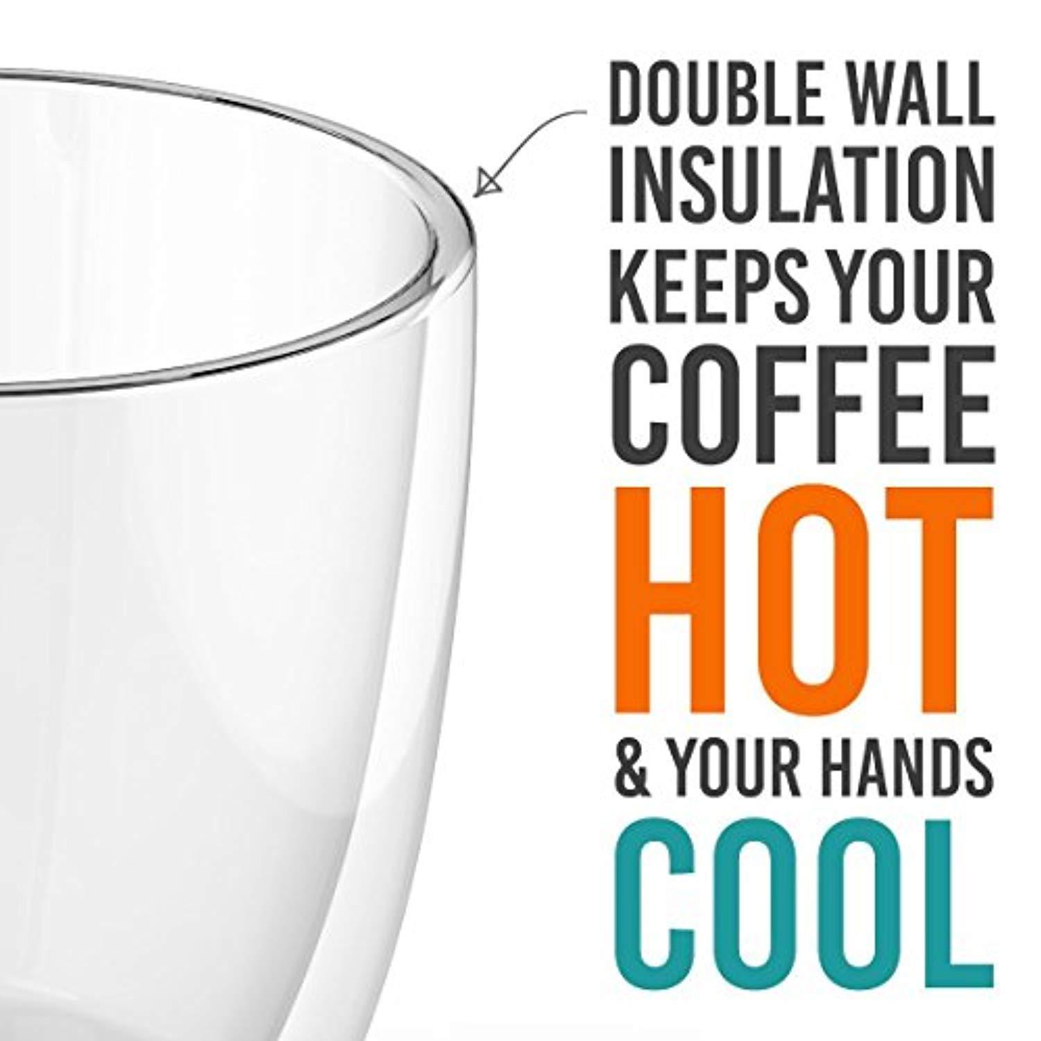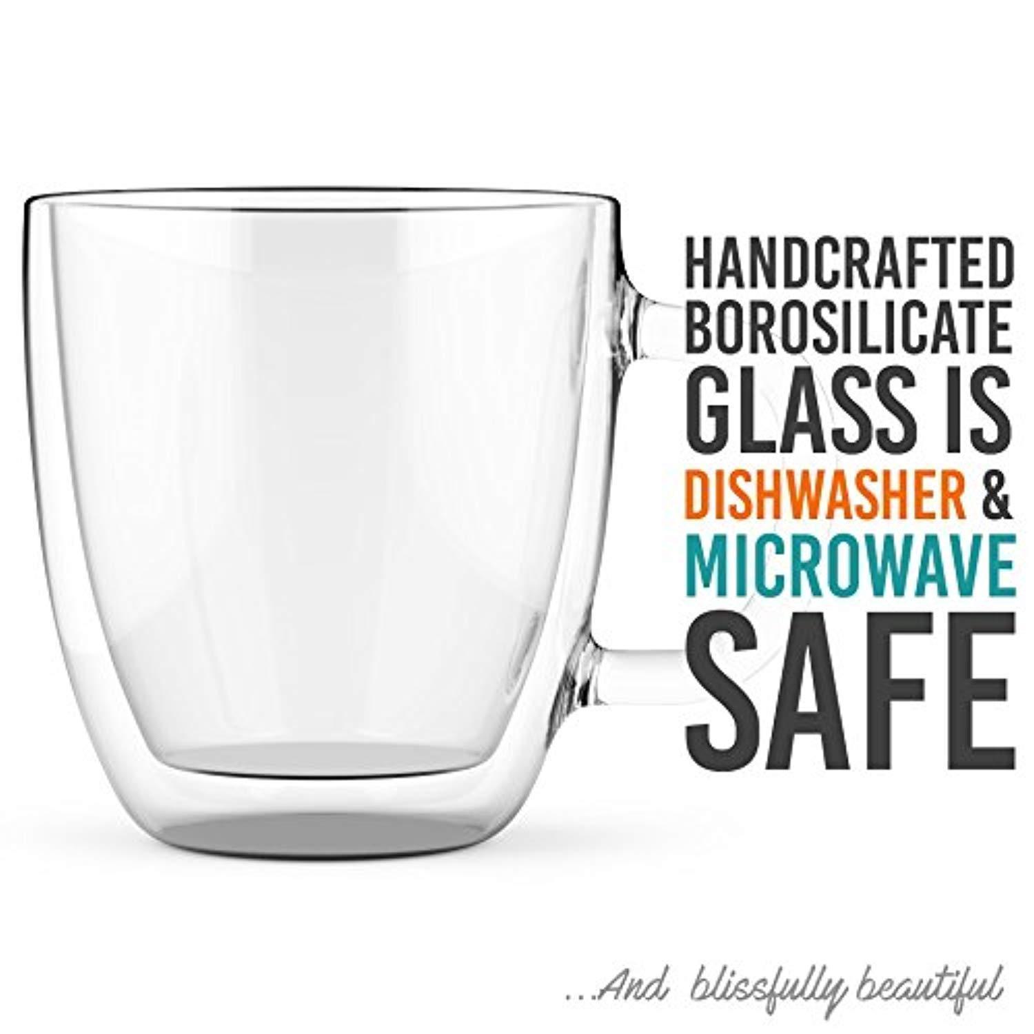 • KEEPS YOUR COFFEE HOT FOR LONGER - Double walled, hand blown glass insulation keeps your coffee hot and your hand cool. No sweat! Also works great for your favorite icy cold drink. Dishwasher & microwave safe.