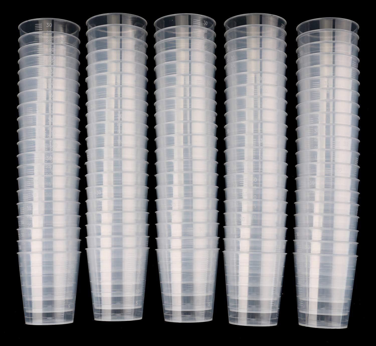 Lawei 100 pack Plastic Measuring Cups - 1 oz Transparent Scale Cups with 100 pack Wooden Stirring Sticks for Mixing Paint, Stain, Epoxy and Resin