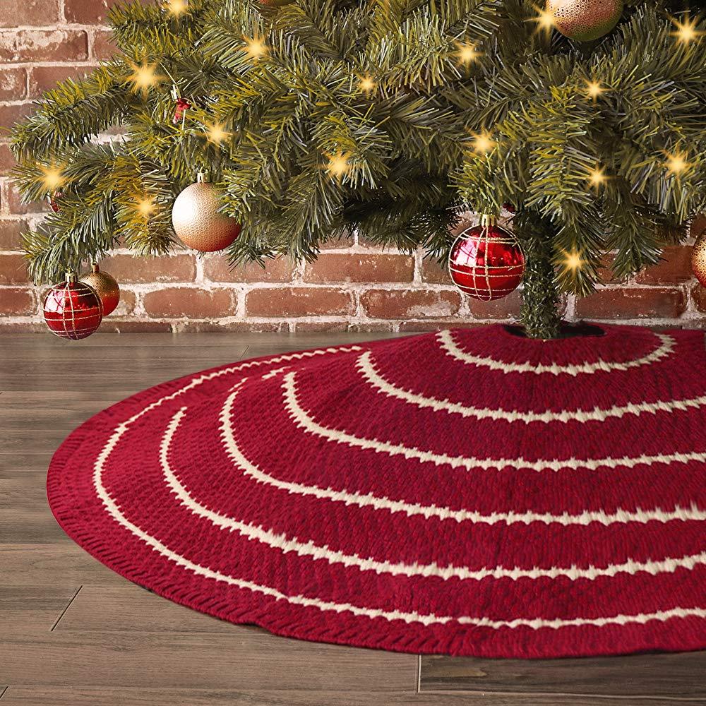 LimBridge Christmas Tree Skirt, 48 inches Knitted Rustic Stripe Thick Heavy Yarn Knit Xmas Holiday Decoration, Burgundy and Cream