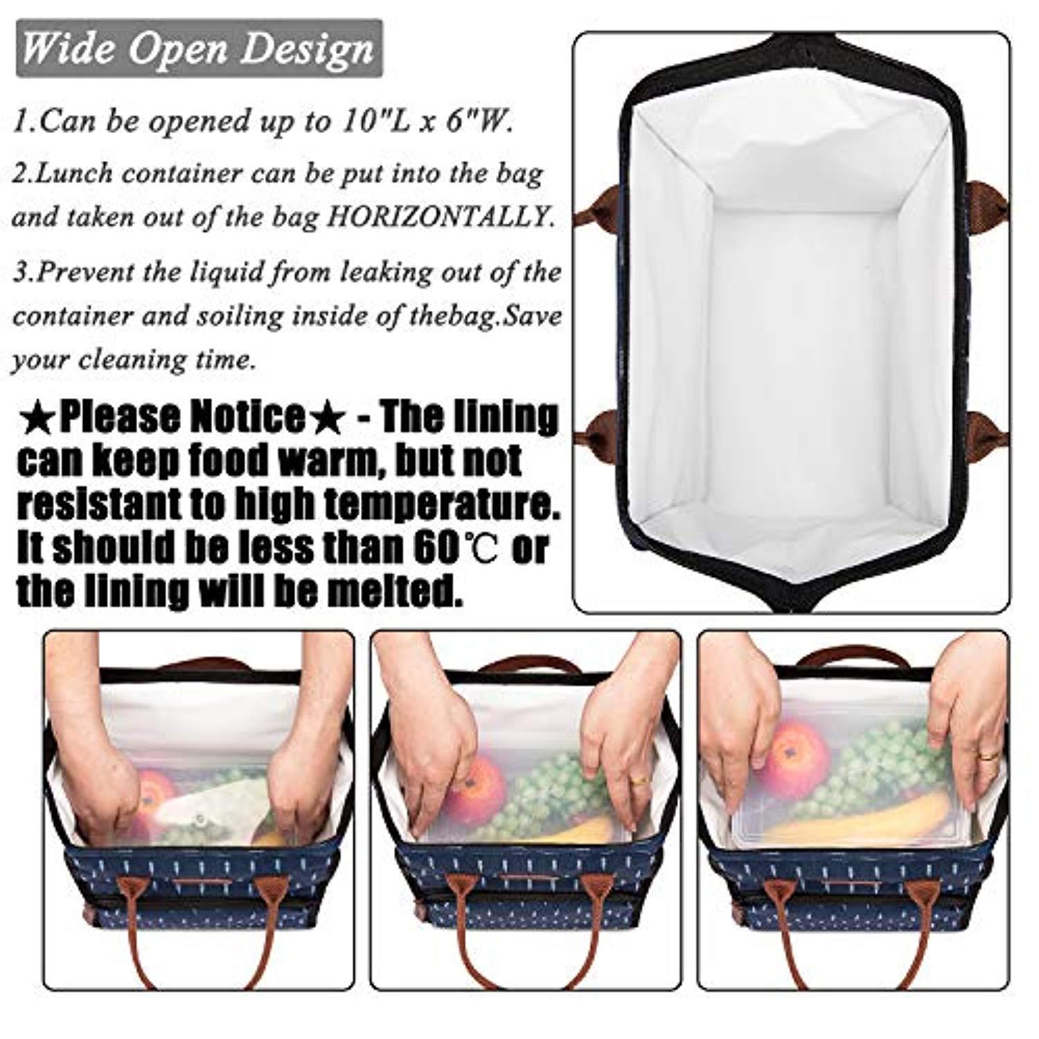 • Wide Open Design - Top of the bag can be opened up to 10"L x 6"W by dual zipper closure, that means your lunch container can be put into the bag and taken out of the bag HORIZONTALLY. Wide open design is for easy accessing and it can prevent the liquid from leaking out of the container and soiling inside of the bag. Save your cleaning time.