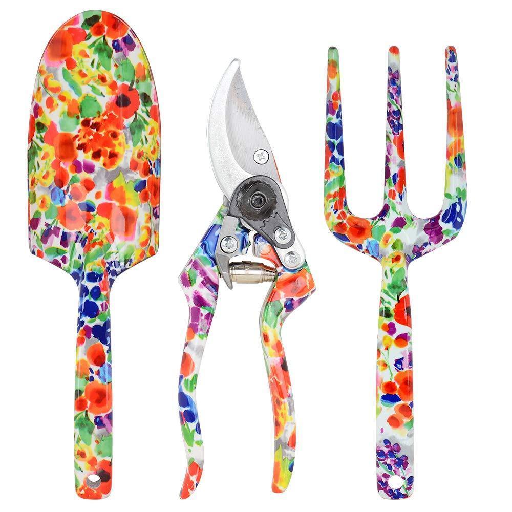 LOYLOV Garden Tool Set Floral Print 9 Piece Aluminum Gardening Tools with 2 Gardening Gloves, Garden Tote, Hand Pruner, Garden Trowel, Hand Rake, Weeder, Fork, Transplanter, Gardening Gifts for Women