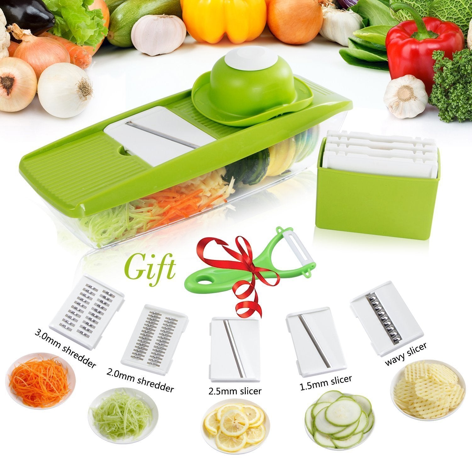 • ✅ save time and effort: This hand-held mandolin slicer will cut your prep time in half, by cutting through potatoes, onions, cheese and vegetables with ease. Space saving, your kitchen will be clean and tidy thanks to the container.