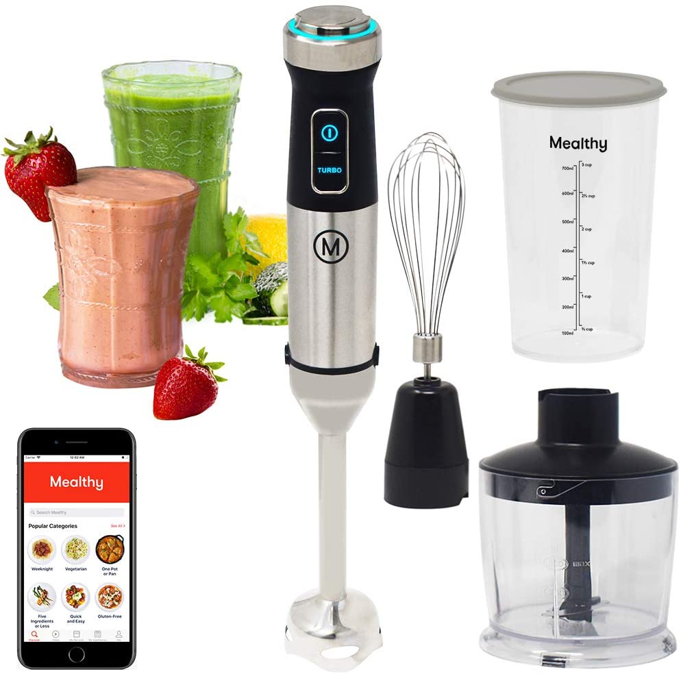 Mealthy Immersion Hand Blender: 500 Watt, 10 Speed Controls Plus Turbo, Includes 500mL Chopper and Whisk, and 600mL Smoothie Cup. Stainless Steel & BPA-free; Instant Access to Recipe App with Videos