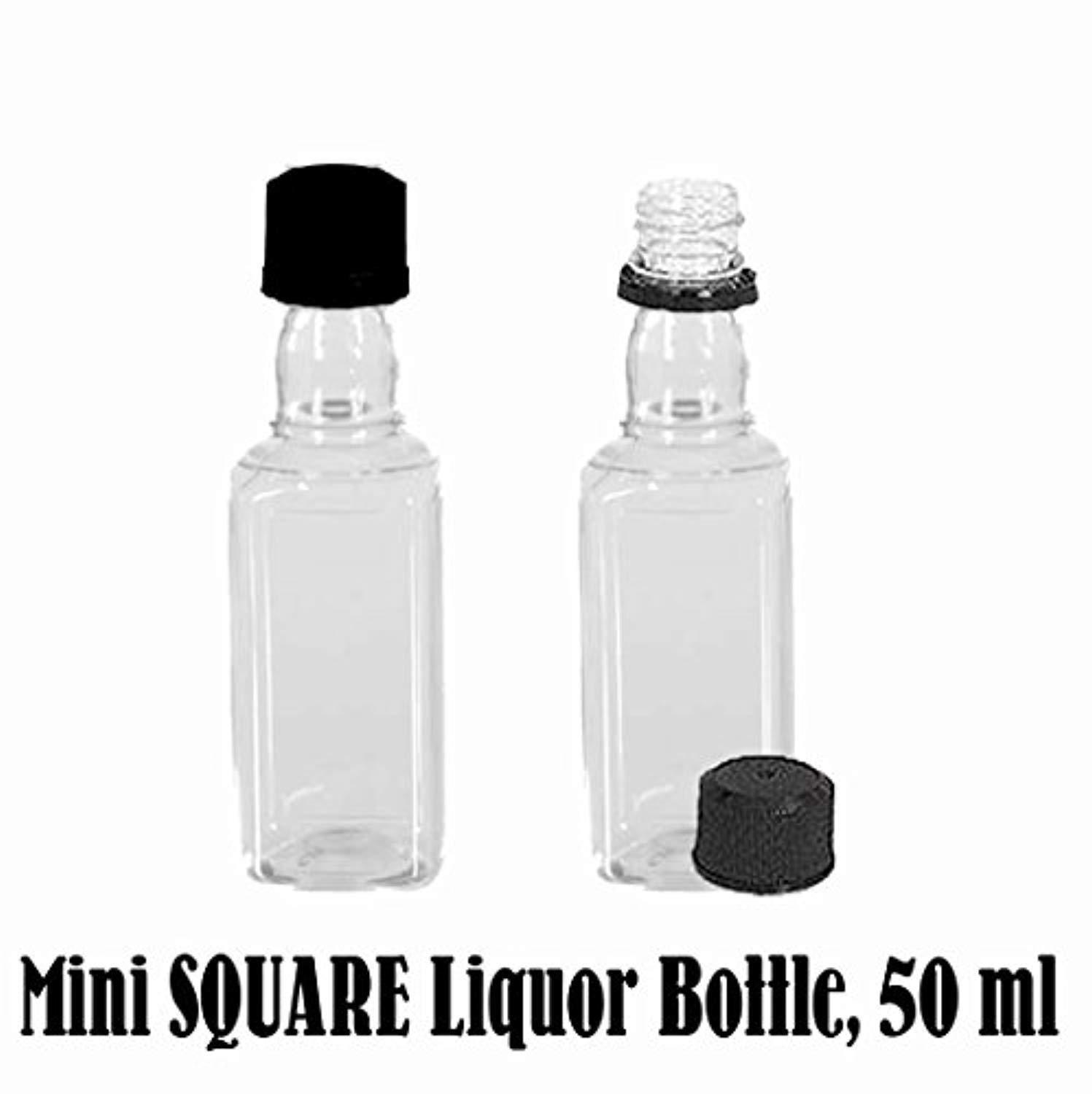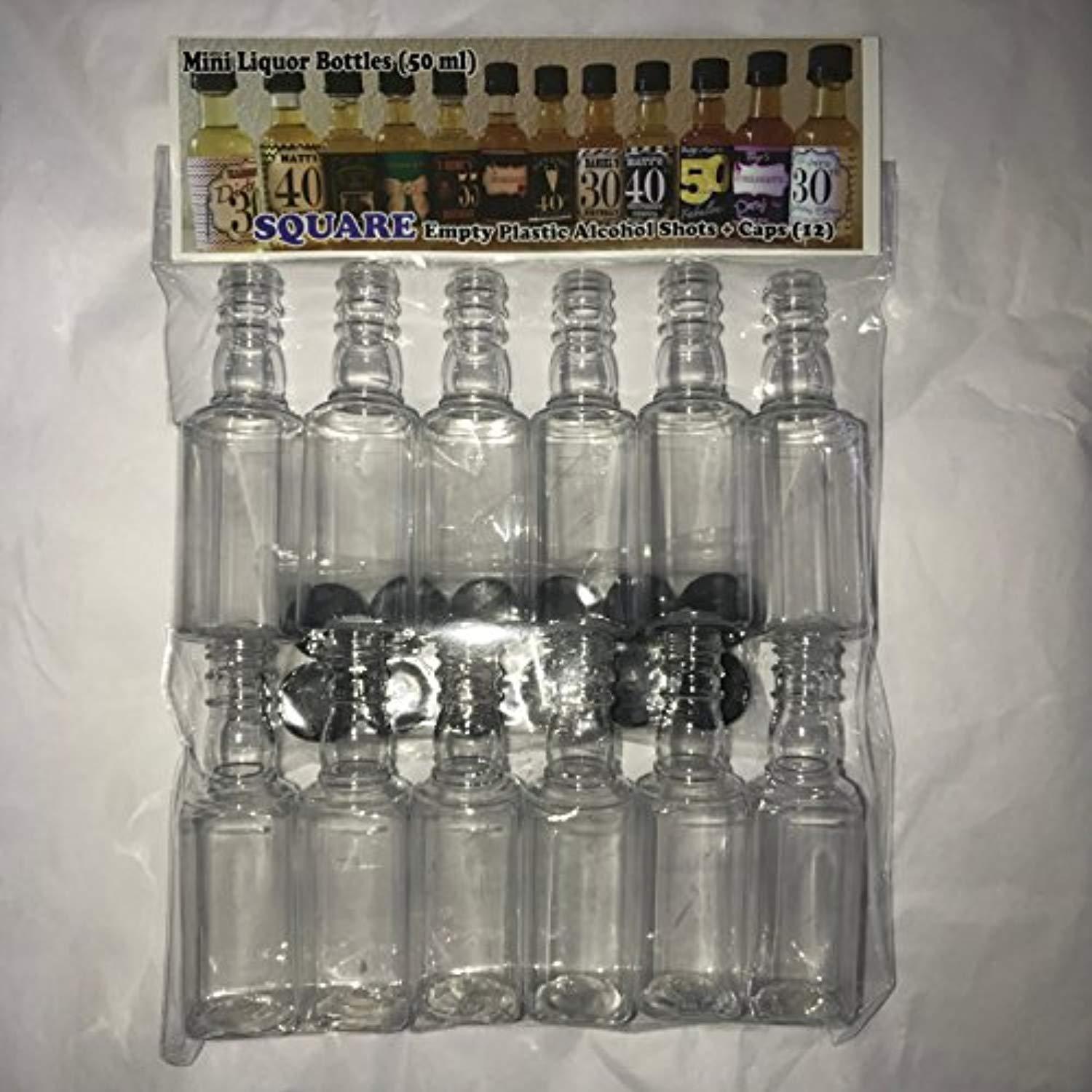 Mini SQUARE Plastic Alcohol 50ml Liquor Bottle Shots + Caps (12)