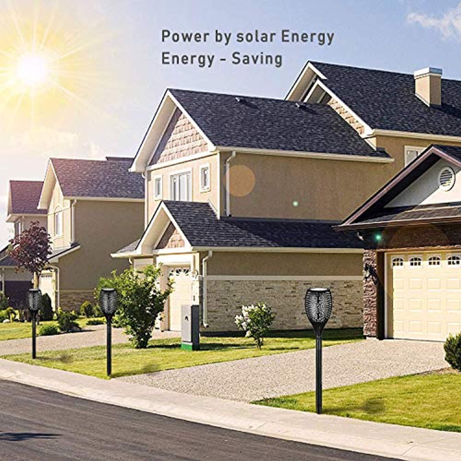 • Dancing Flame Design - A safe alternative to the real “flames” — 96pcs LEDs in the light cast a safe, soft, mood-enhancing glow.The actual height of the solar torches is 33.5 inches.(Accessories include)