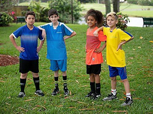 • ⚽ MADE COMFORTABLE FOR HOURS OF PLAY - This set is made with high premium polyester quick dry material. Lightweight and breathable, your kid will always be comfortable. And is so durable, will stay perfect as you keep washing it. These sets for boys an girls can also work as a costume. Great colors to wear on a indoor soccer game.