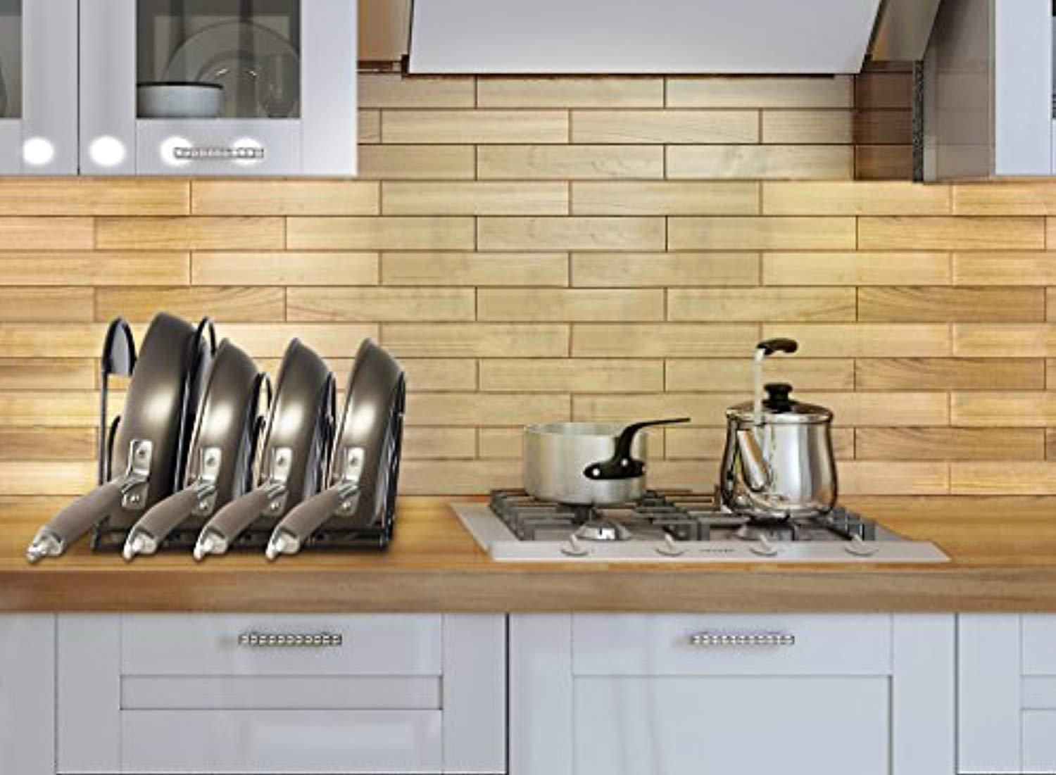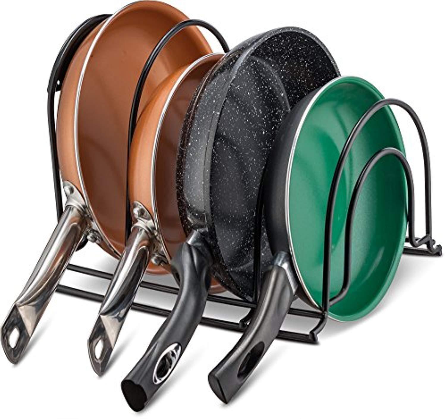 • GENEROUS CAPACITY: This organizer rack features 5 “shelves,” enough to hold 2 14-inch pans and 3 9-inch pans, or 6 large lids and 2 pans. That will save loads of space!