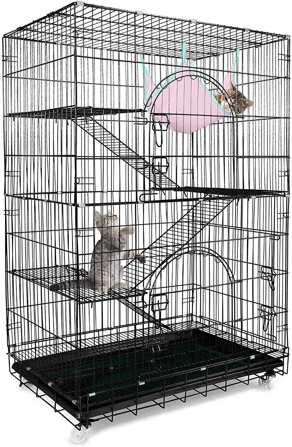 • SATISFACTION GUARANTEE: We know you and your cat will love our high-quality product; please contact us immediately with any questions or concerns; BUY WITH CONFIDENCE the PETSMATIG LARGE METAL CAT CRATE that comes complete with openings with locks, platforms, ladders, a hammock, bottom tray, attachable wheels, ribbon ties, grooming gloves, and detailed instructions, making it the perfect place for your beloved feline to feel comfortable and happy, out of constant foot traffic and harm’s way
