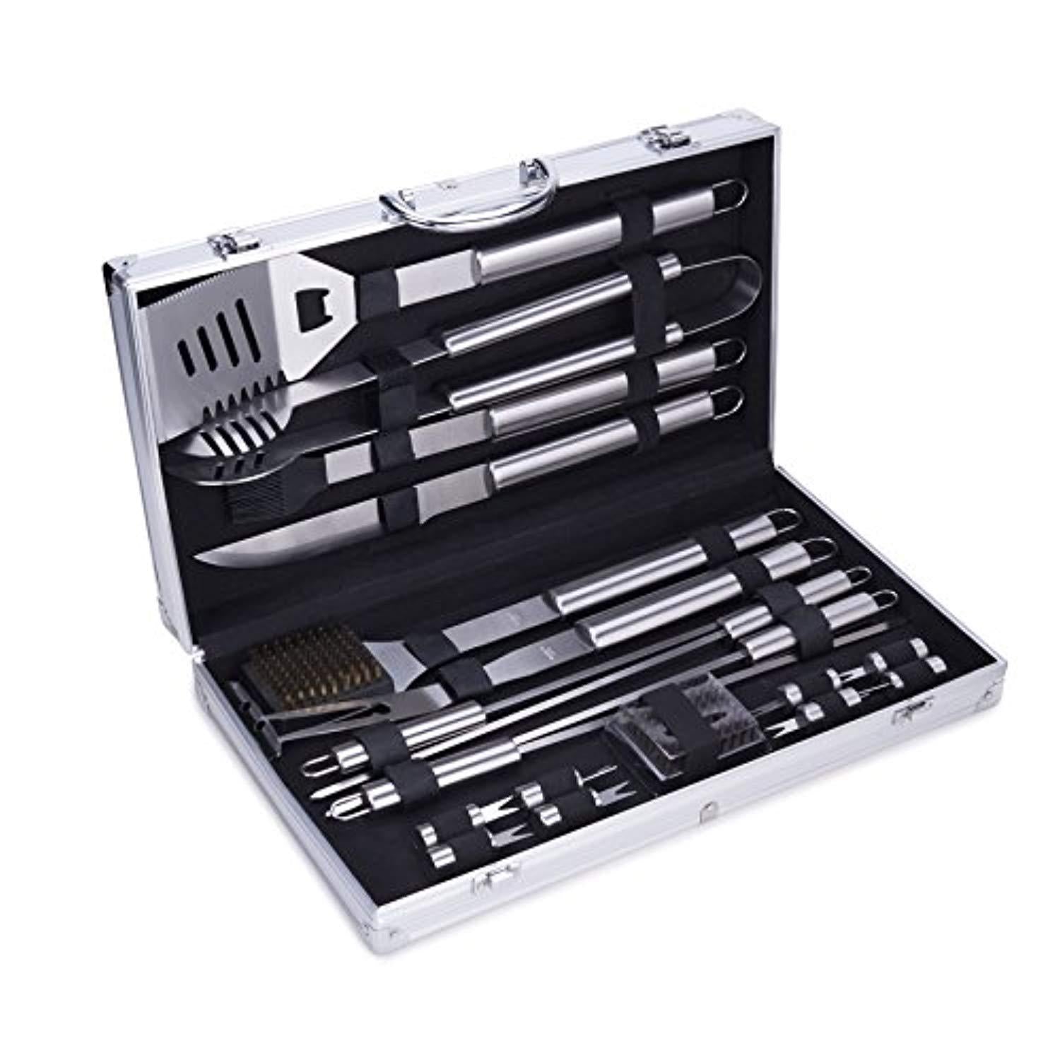 【COMPLETE GRILL ACCESSORY SET】, comes with 19 pieces stainless steel tools along with an aluminum carrying case,...
