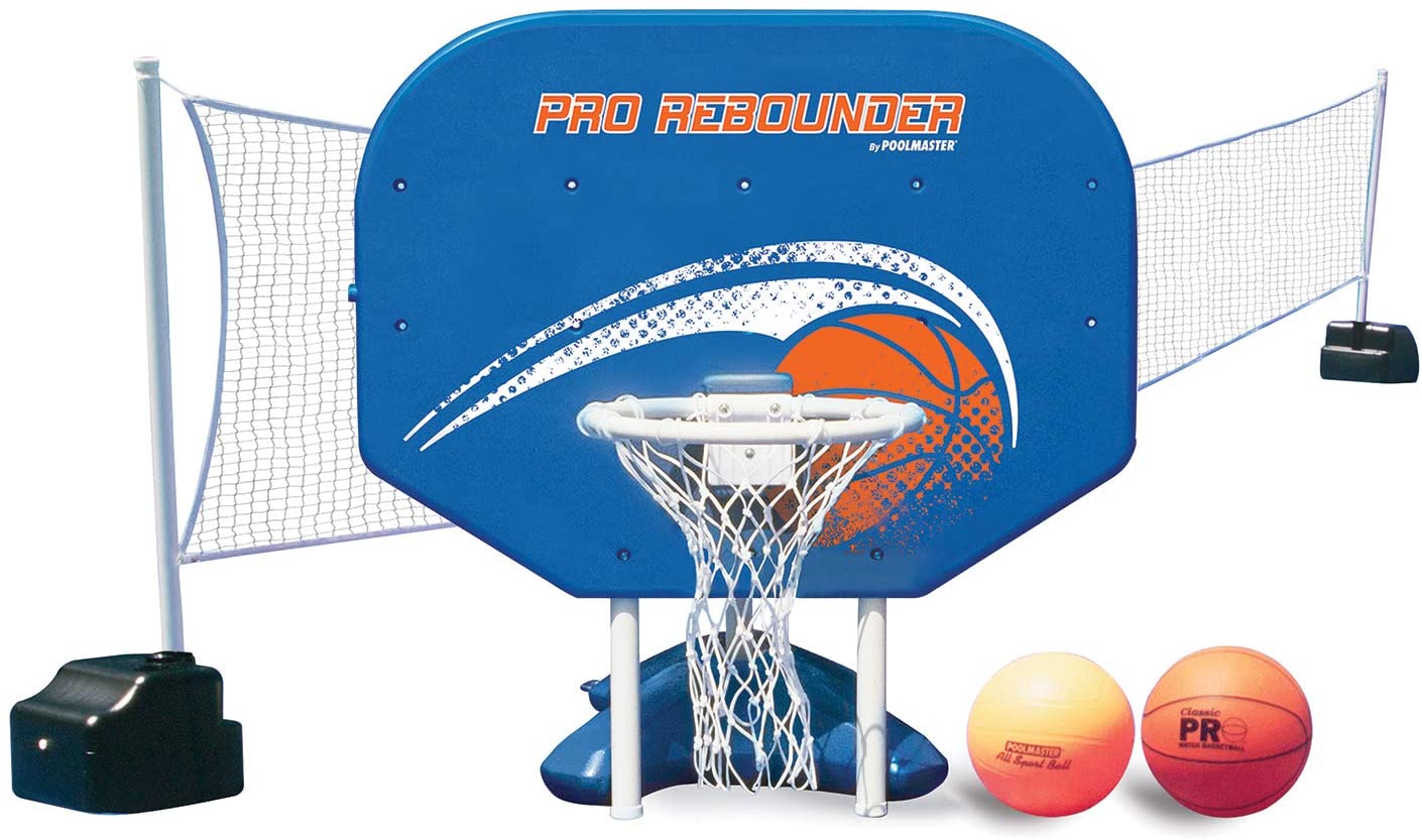 Specially designed poolside basketball or across-pool volleyball action for above-ground poolsCombination poolside basketball and across-pool volleyball game...