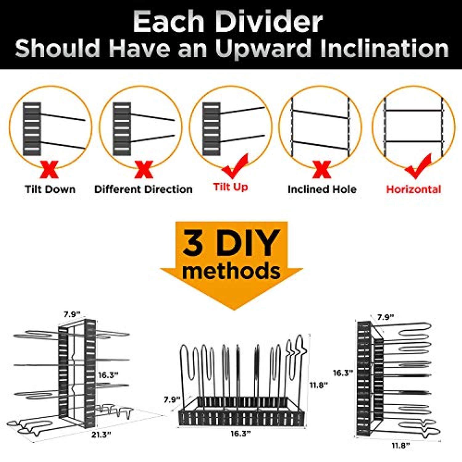 • [TWO Installation Modes] There are two unique designs for installation methods. The pot lid rack coming with 8 adjustable tiers, you can either install 8 tiers on one side of the pan rack or install 4 tiers on both sides of the pan rack.